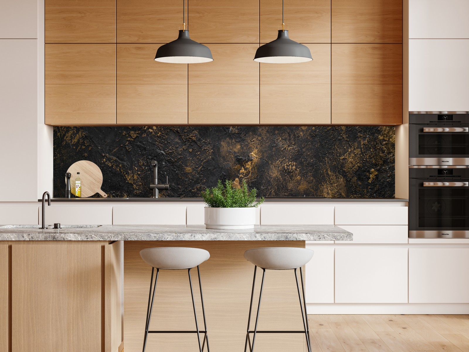 Markante schwarz-goldene Textur verleiht Räumen einen industriellen, luxuriösen Charakter und Tiefe.
