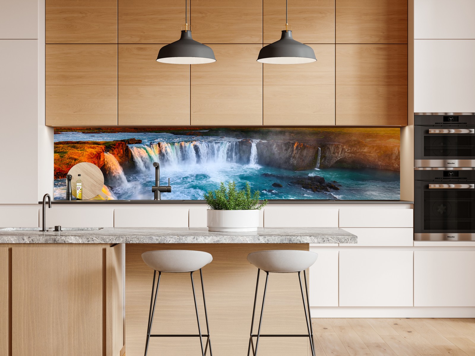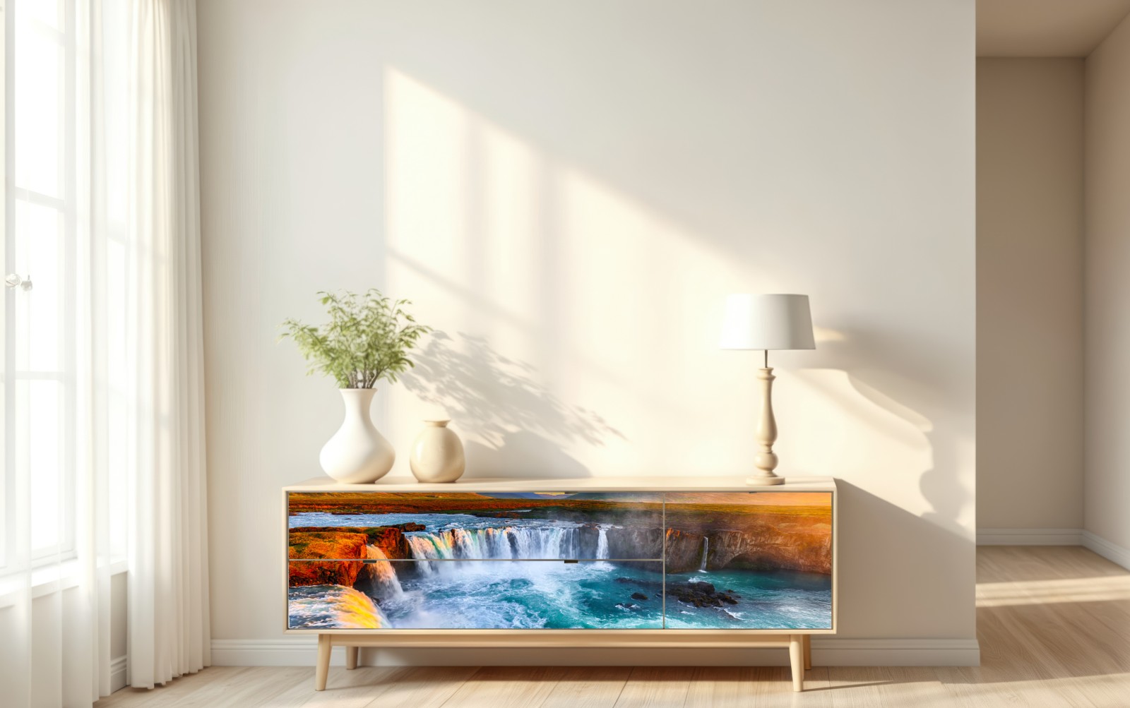 Atemberaubender Sonnenaufgang über Godafoss mit türkisblauem Wasser und dramatischem Himmel, der einen kraftvollen Blickfang für jeden Raum schafft.