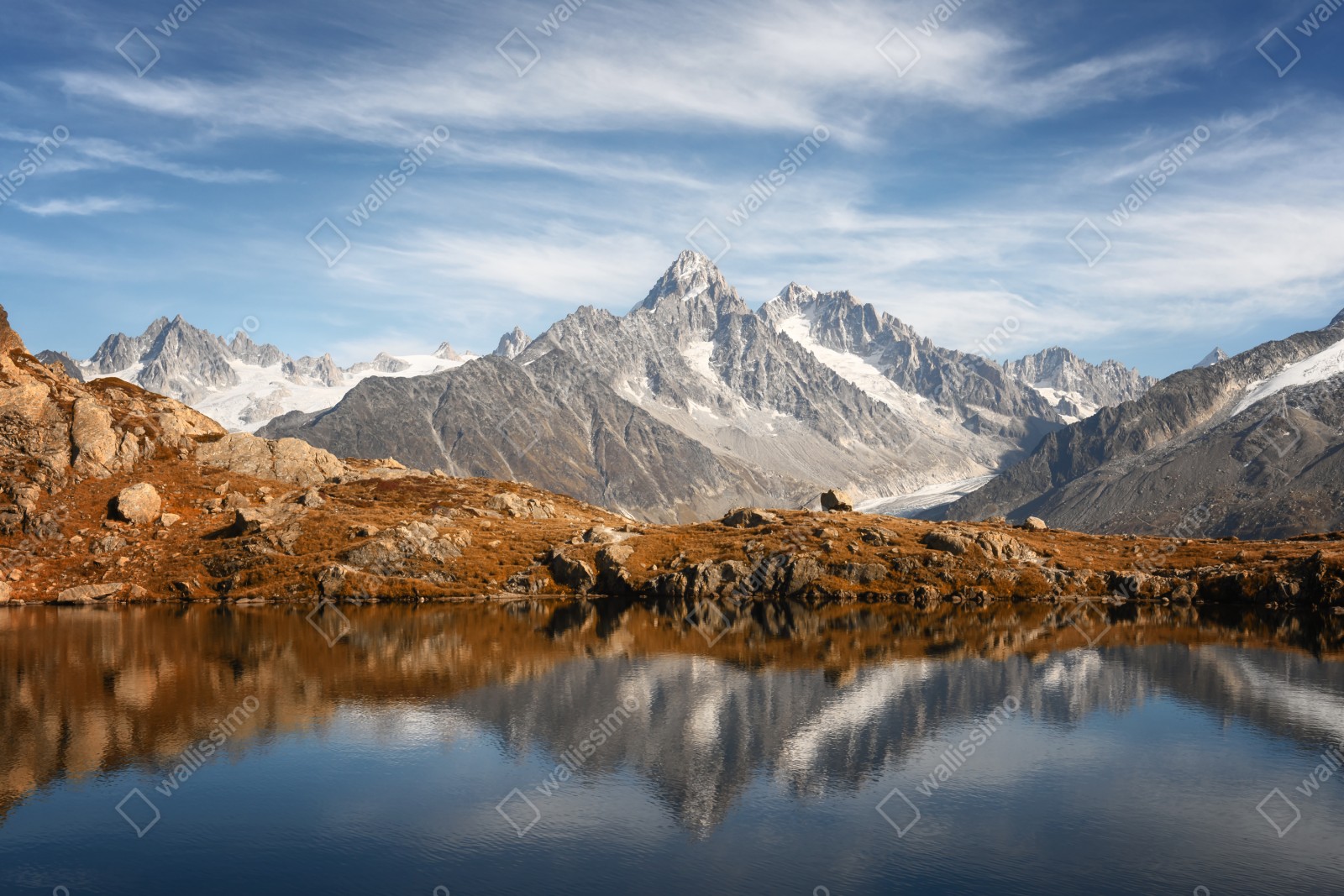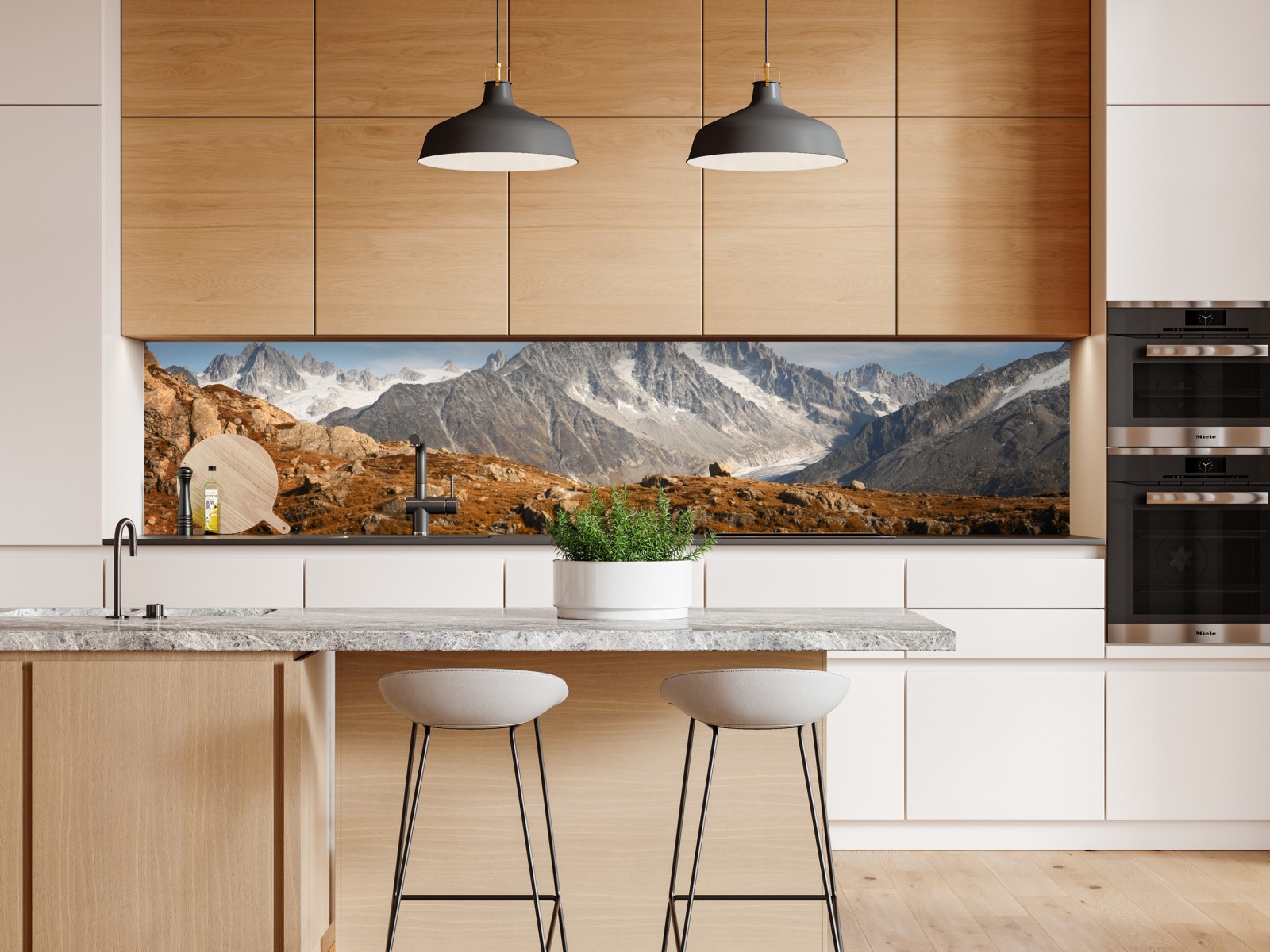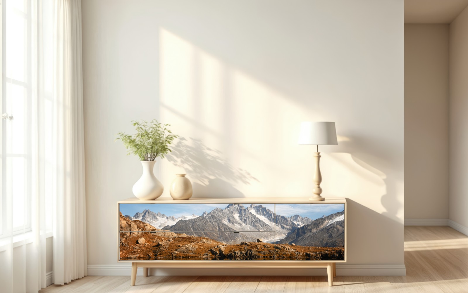 Atemberaubende alpine landschaft mit majestätischen gipfeln, die sich im ruhigen see spiegeln, ideal zur schaffung einer natürlichen atmosphäre im raum.