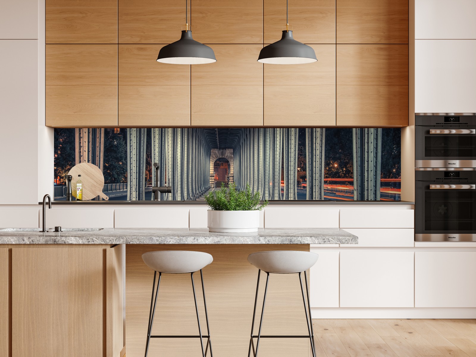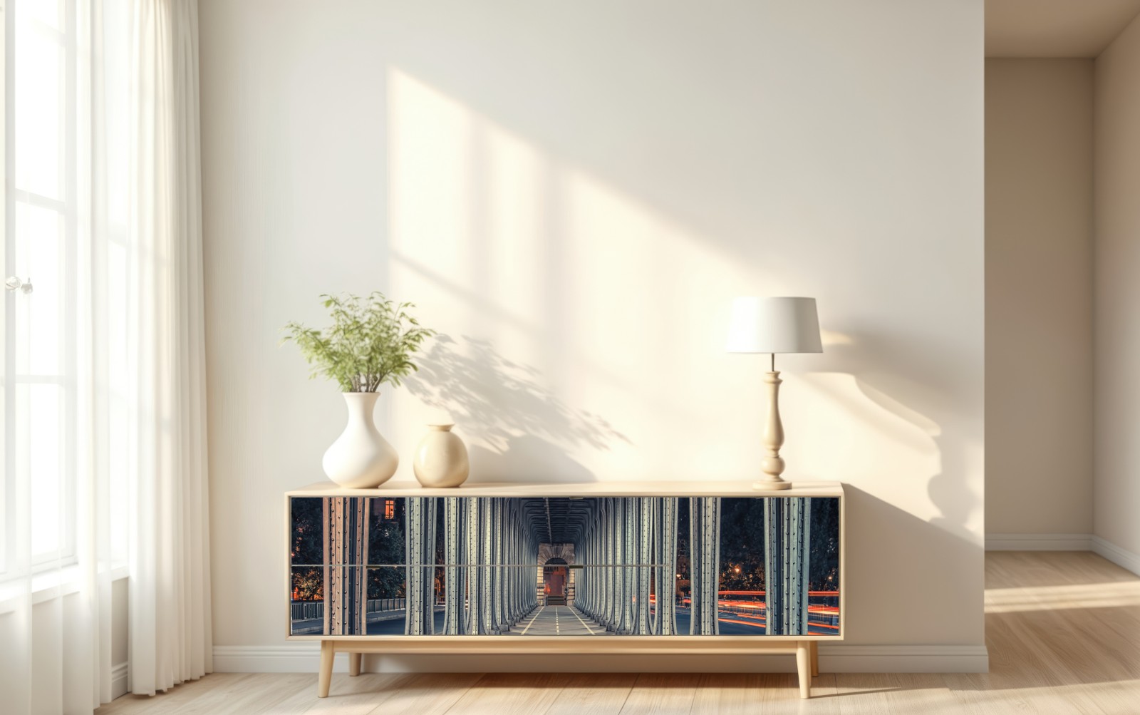 Ein eindrucksvolles Architekturfoto, das die rhythmischen Säulen und die Fluchtpunktperspektive einer Stahlbrücke bei Dämmerung einfängt und jedem Raum einen industriellen Charme verleiht.