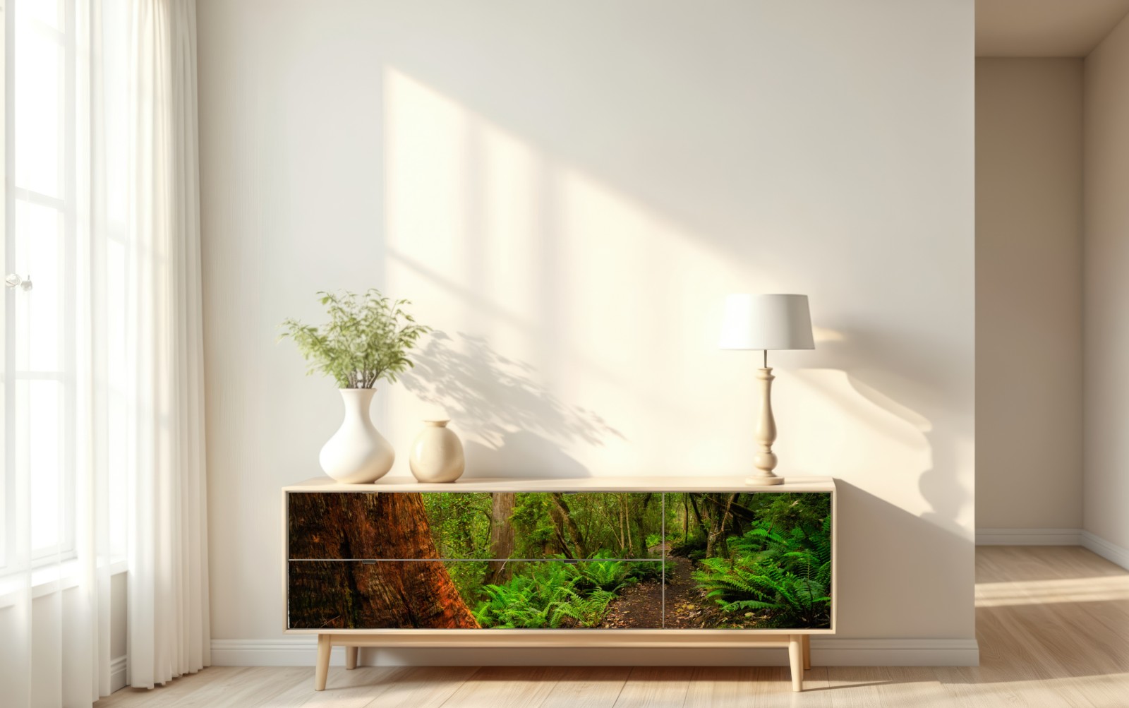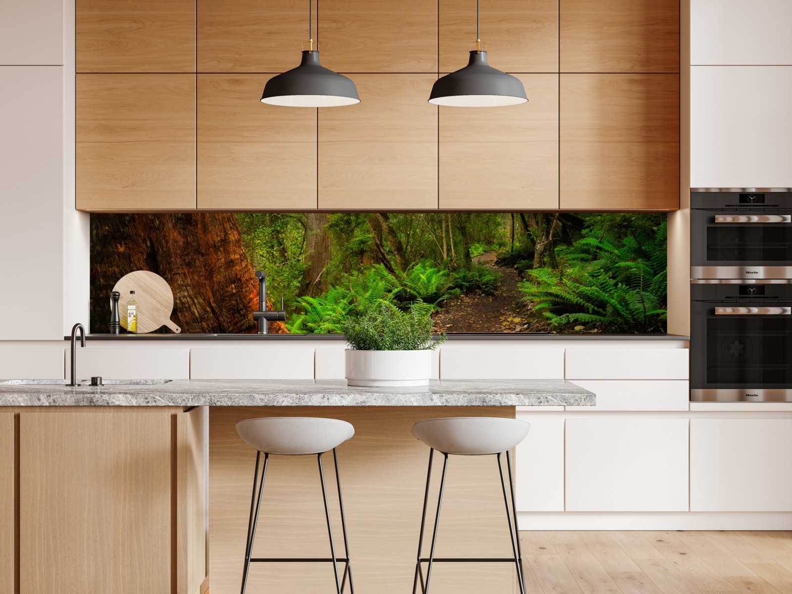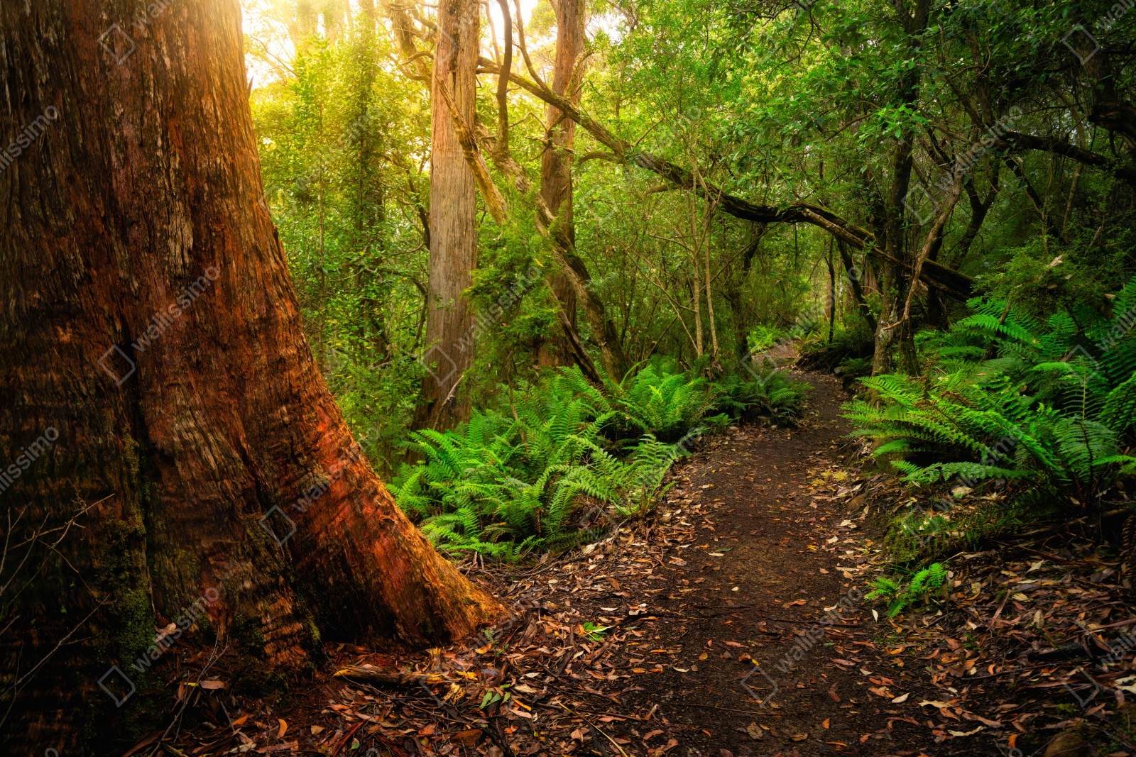Bringen Sie die ruhige Schönheit eines uralten Regenwaldes aus Tasmanien in Ihr Zuhause mit diesem üppigen Waldweg-Motiv, ideal zur Schaffung einer natürlichen, beruhigenden Atmosphäre.