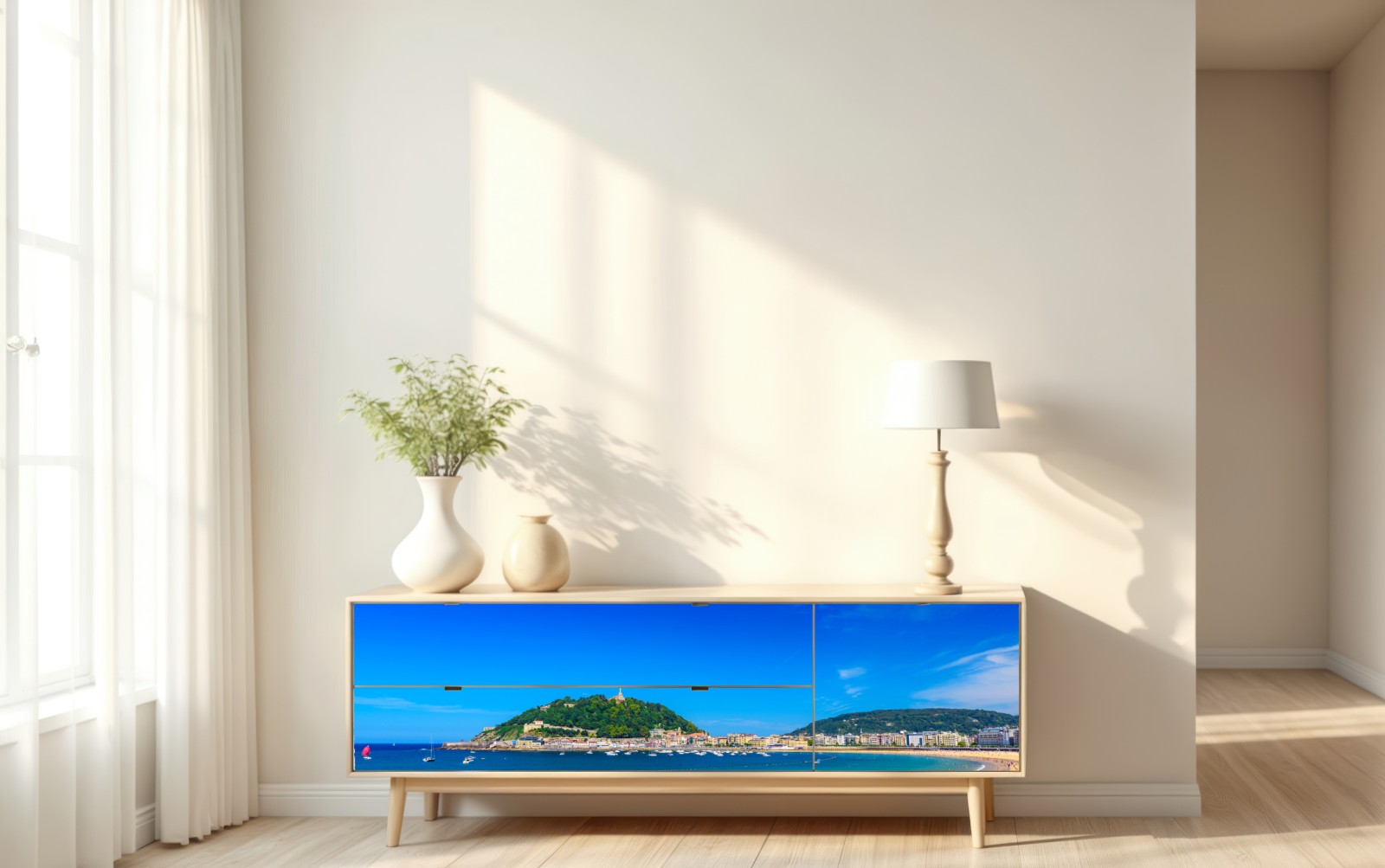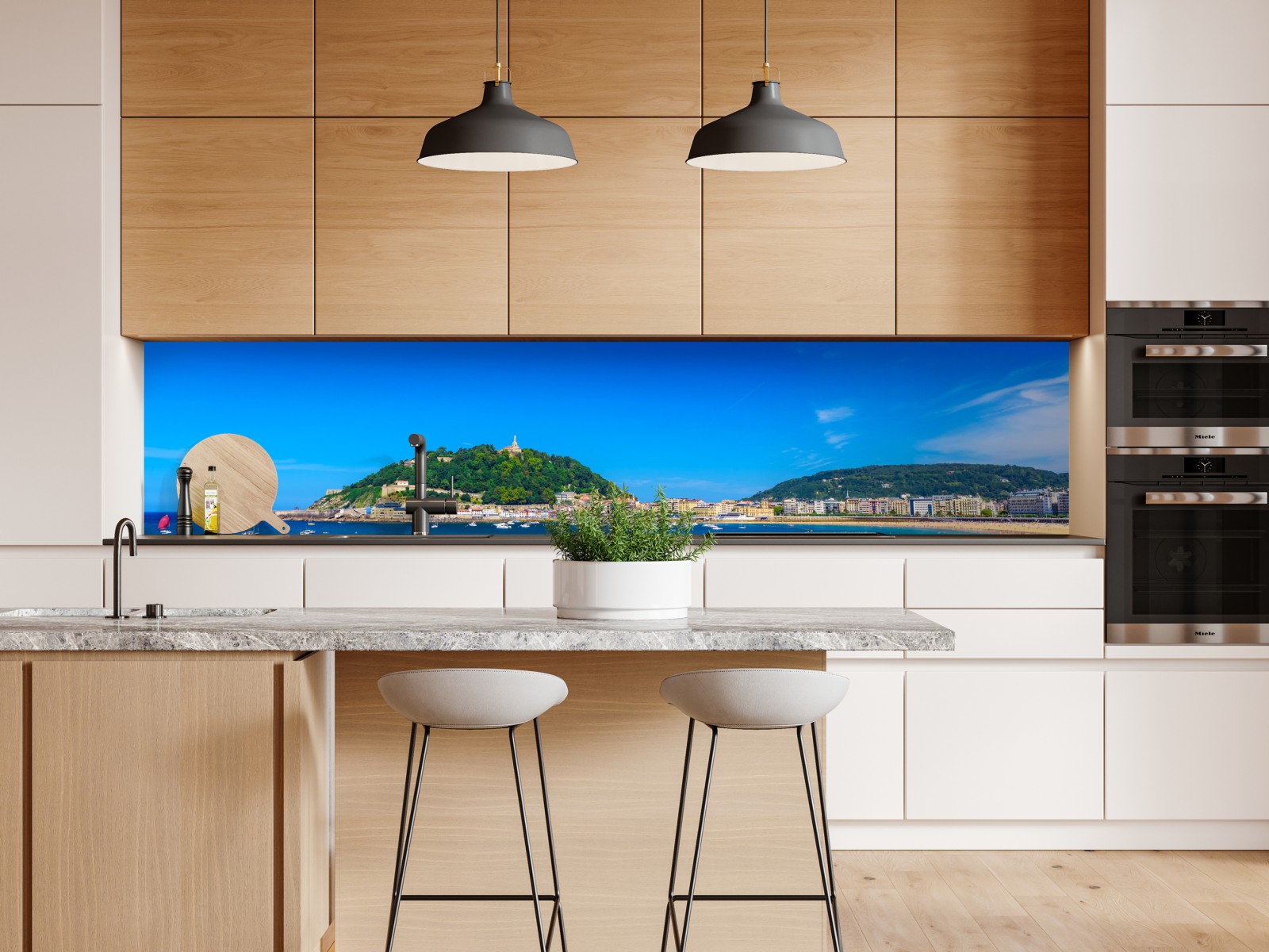 Bringen Sie mit diesem lebendigen sonnigen Küstenpanorama Meeresruhe und intensive Farben in jeden Raum.