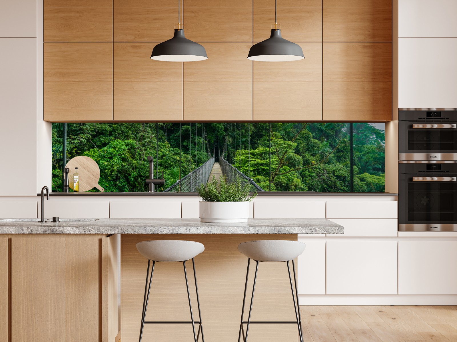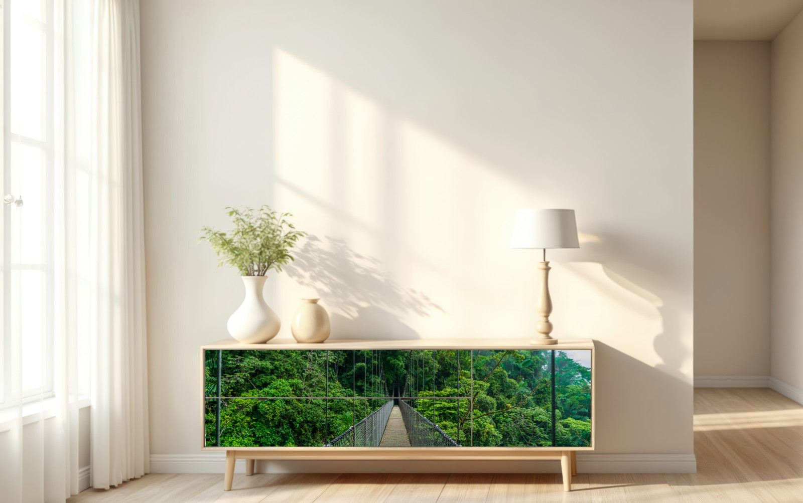 Ein beeindruckender Blick auf eine Hängebrücke, die in einen lebendigen tropischen Regenwald führt, ideal für Räume mit Naturbezug.