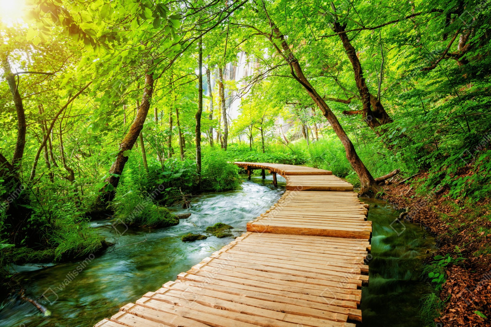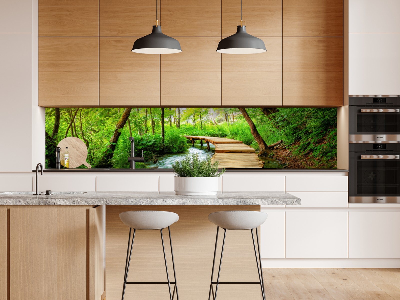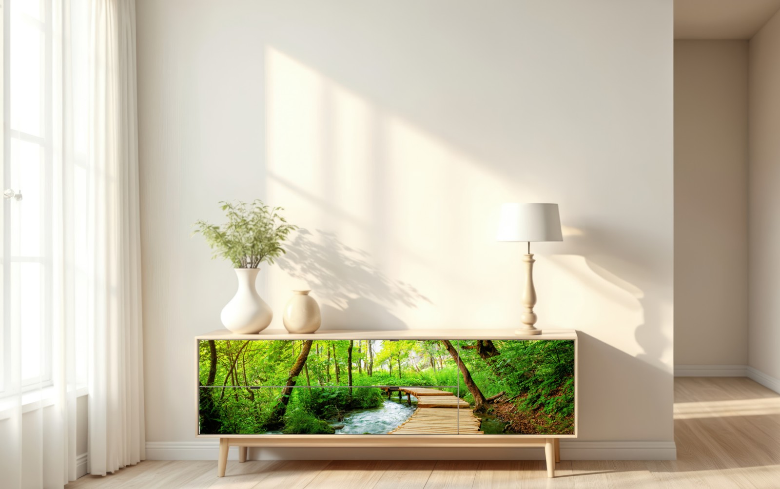 Ein ruhiger grüner Waldweg über kristallklare Bäche und Wasserfälle, der natürliche Gelassenheit und frische Energie in Ihren Raum bringt.