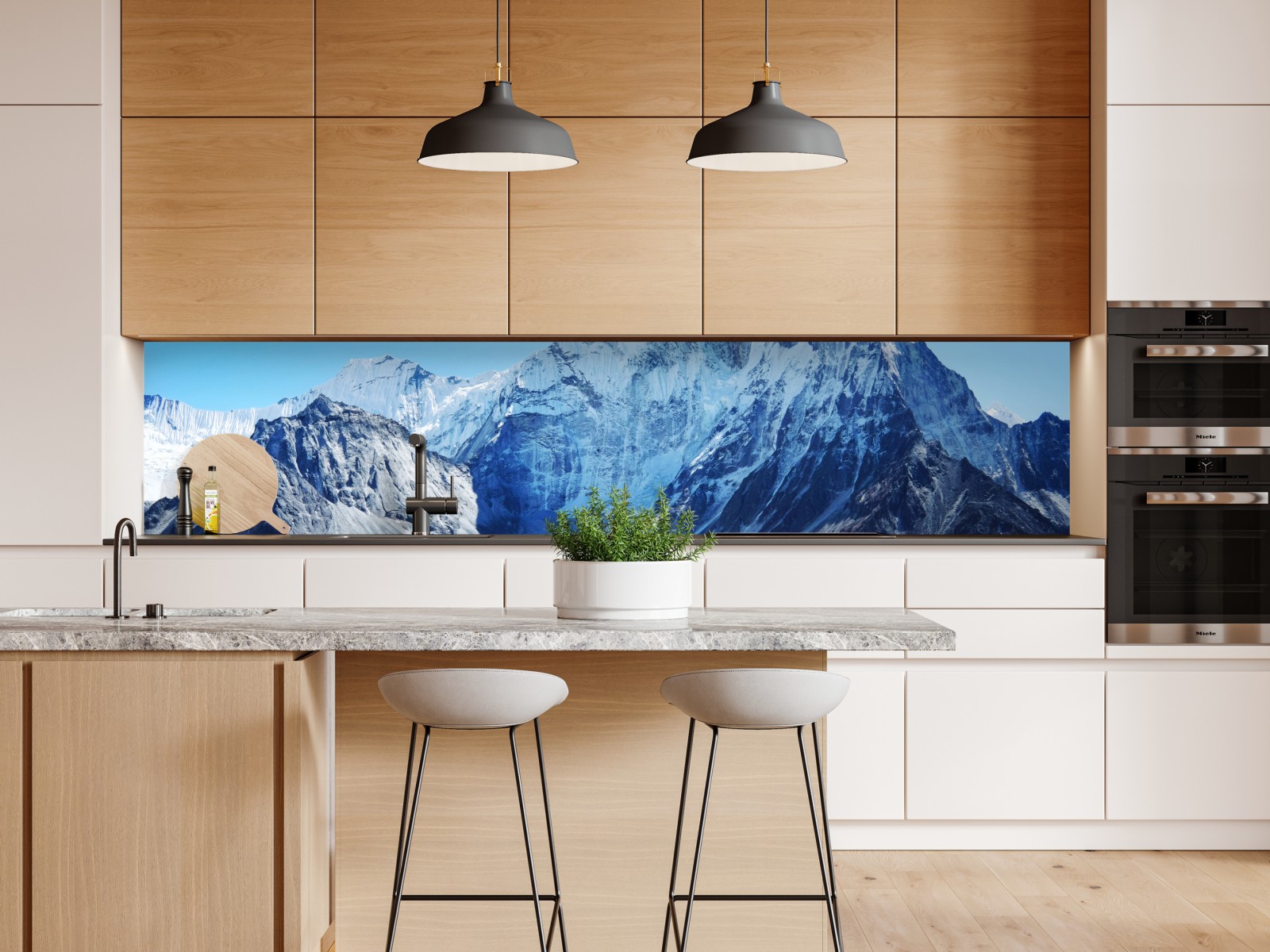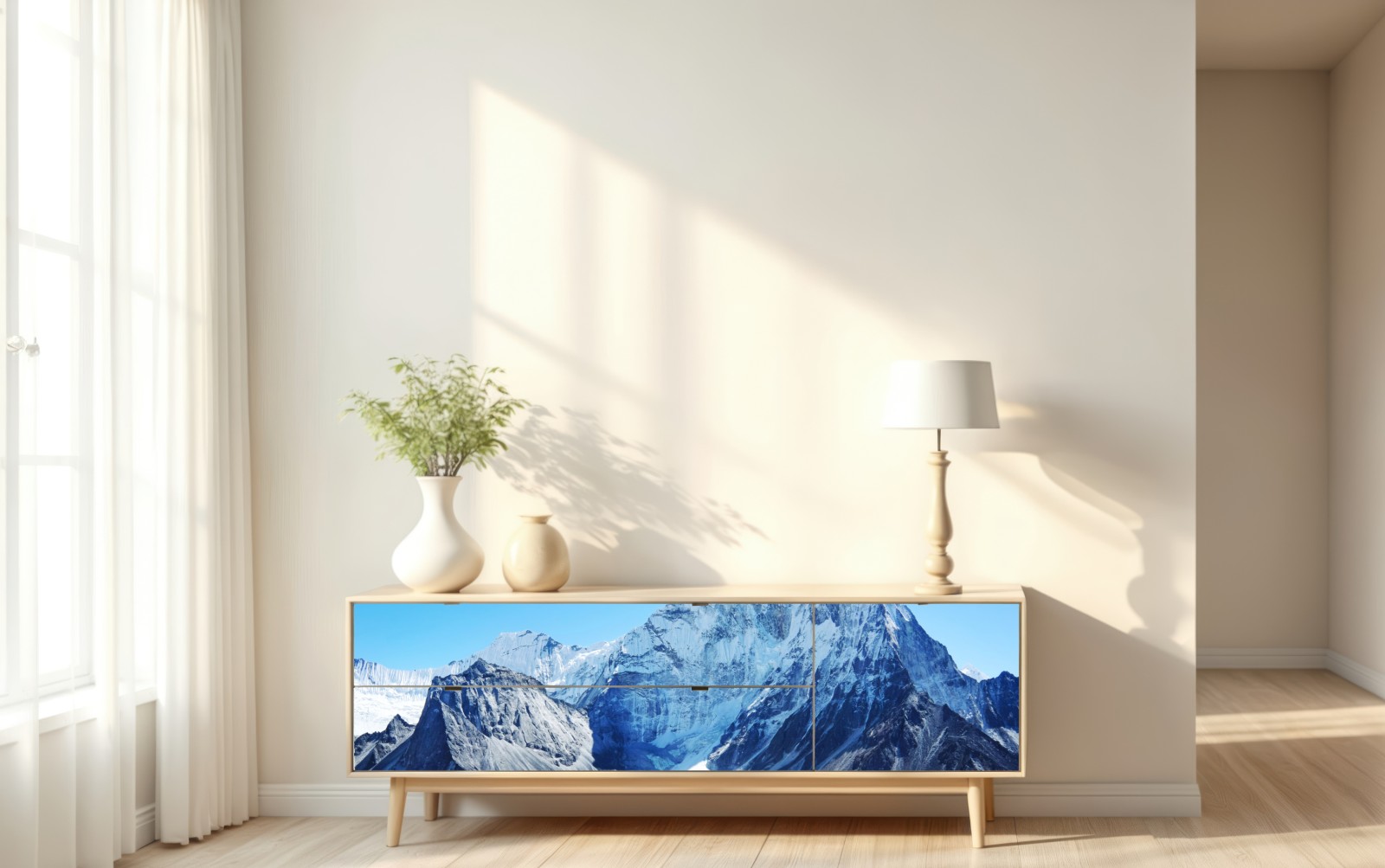 Eine beeindruckende Alpenlandschaft mit einem hohen schneebedeckten Gipfel, Gletschern und türkisfarbenen Seen, die jedem Raum natürliche Ruhe verleiht.