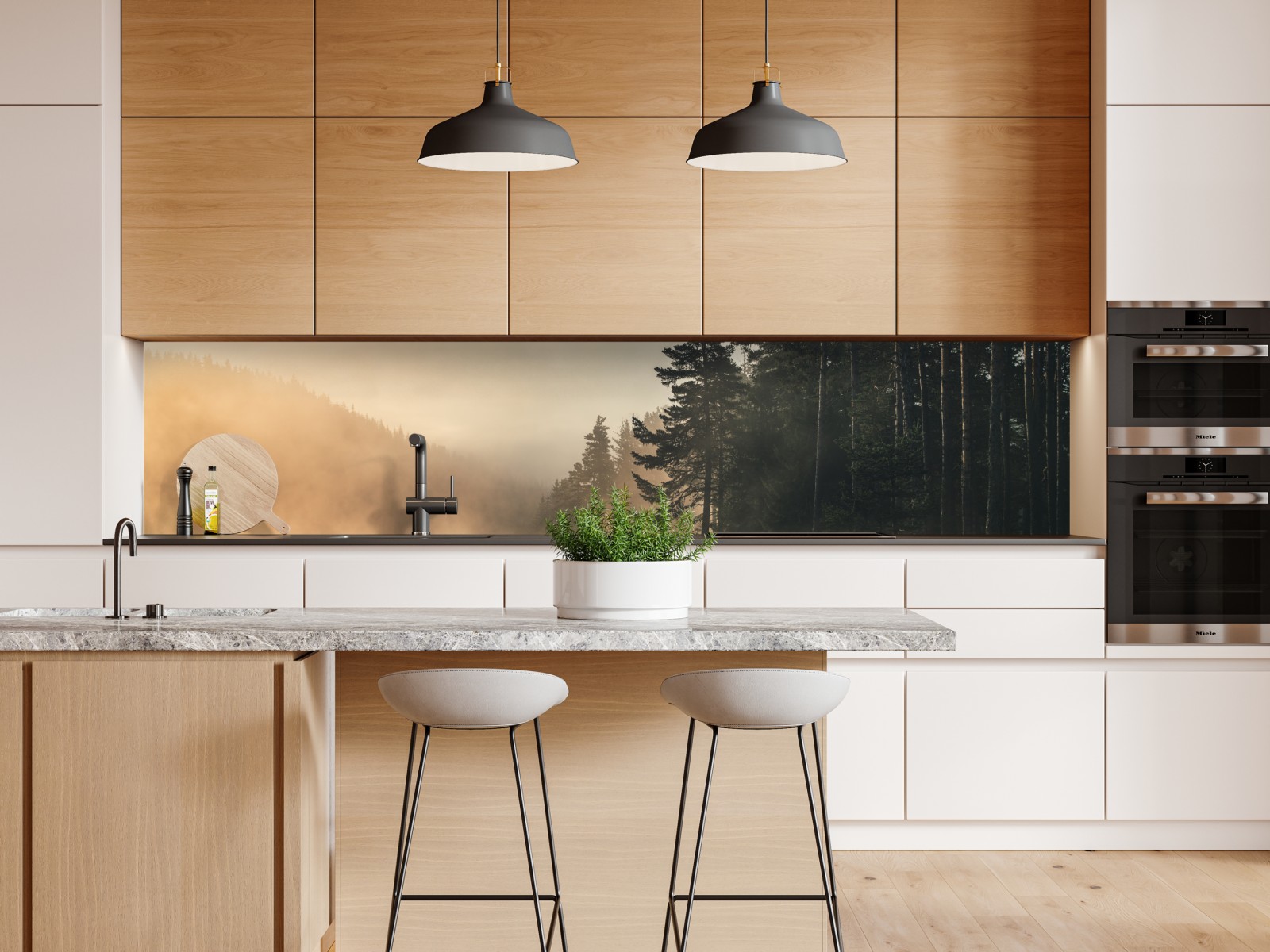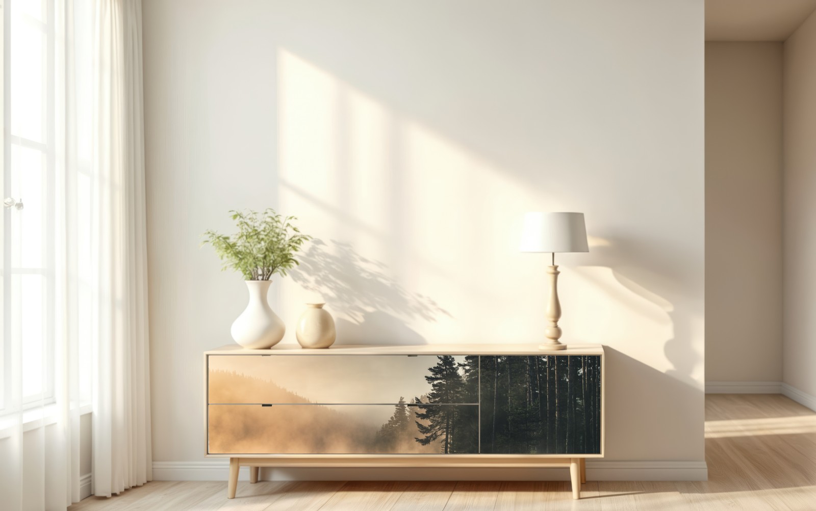 Ein ruhiger, nebliger Sonnenaufgang über einem Waldsee, ideal um eine natürliche, entspannte Atmosphäre in Ihr Zuhause zu bringen.