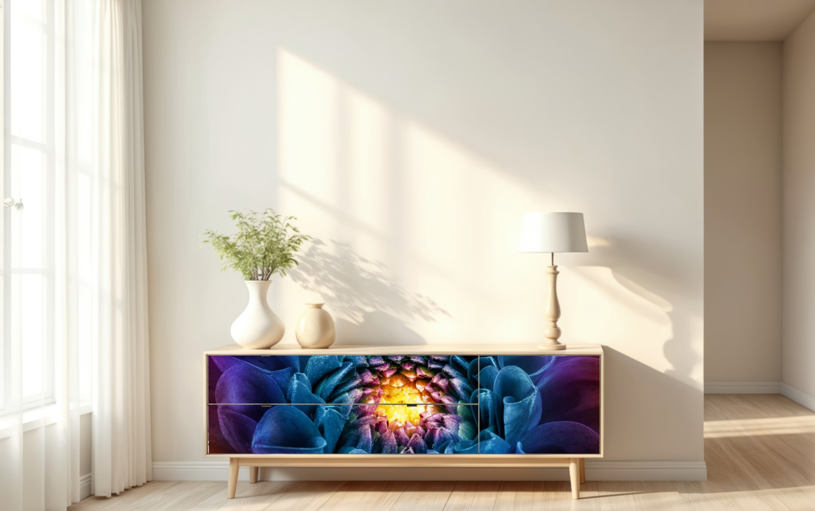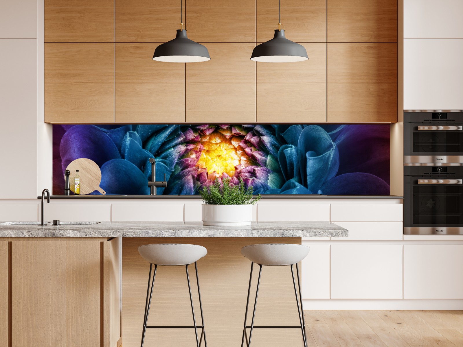 Beeindruckende Makroaufnahme einer bunten Chrysantheme mit tiefen Blautönen und strahlendem Gelb, ideal zur Belebung von Wohnräumen.