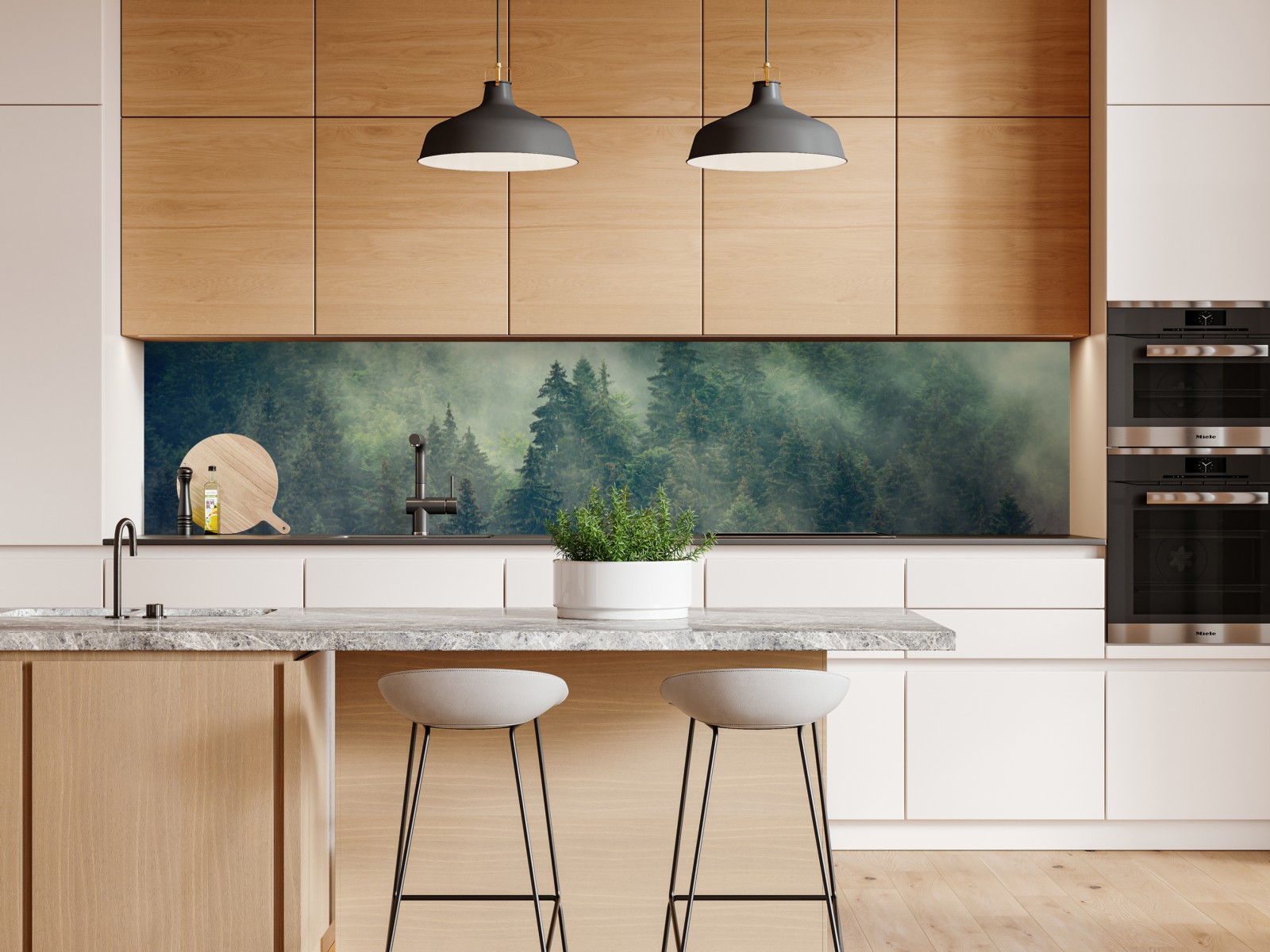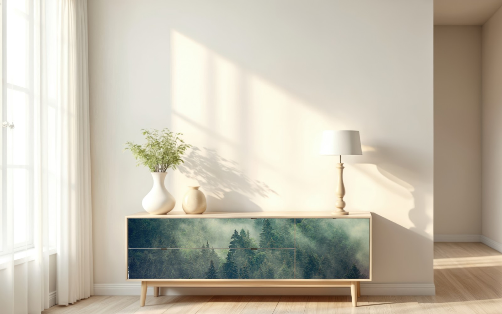 Beruhigender Druck eines nebligen, immergrünen Waldes, der Tiefe und Gelassenheit in Ihr Zuhause bringt.