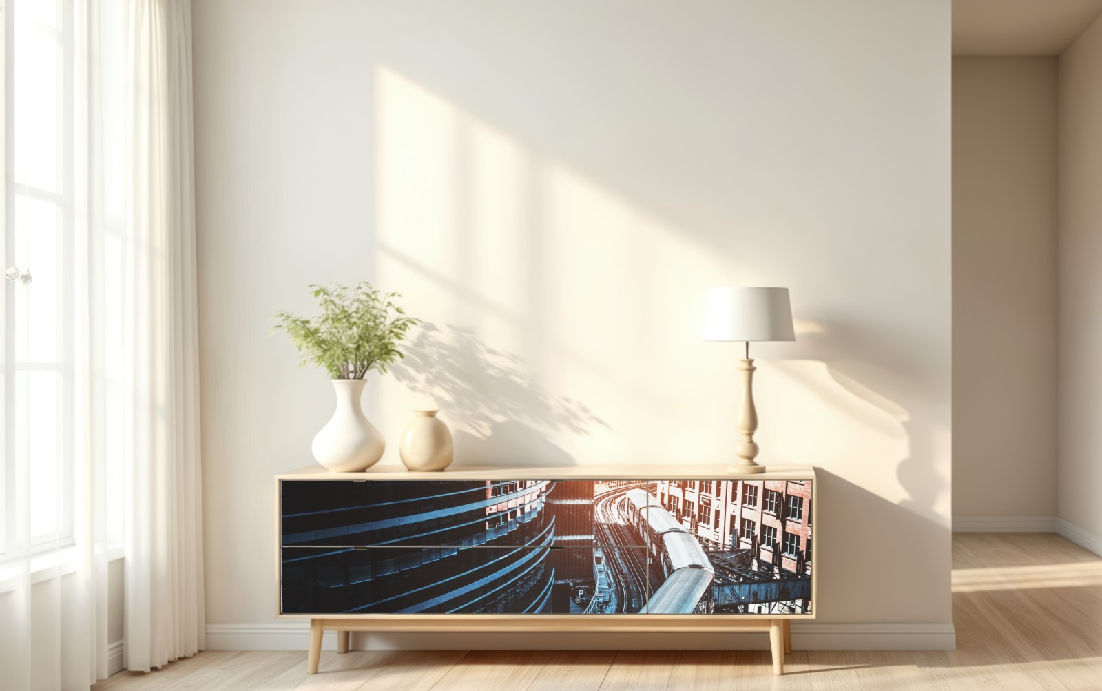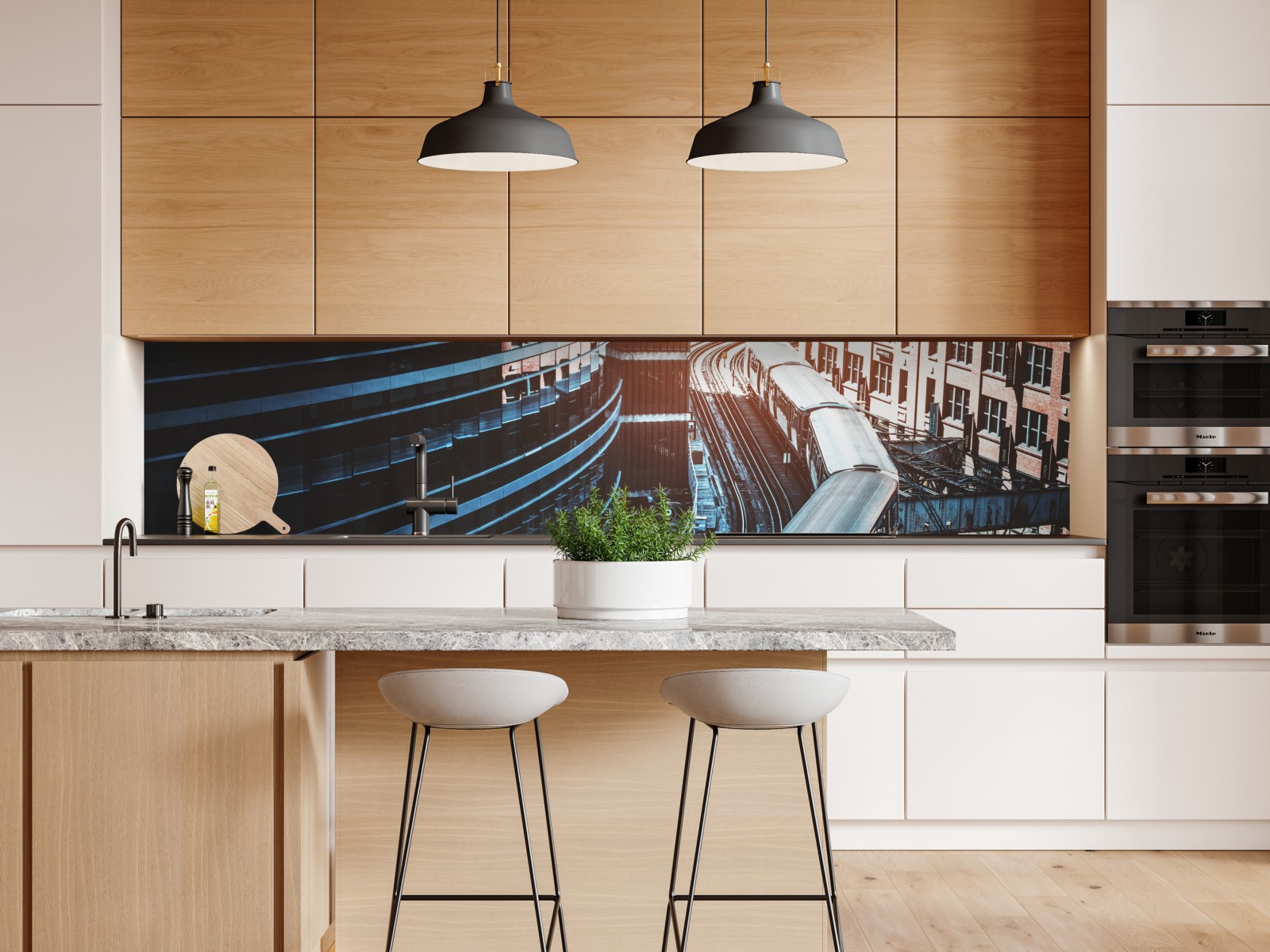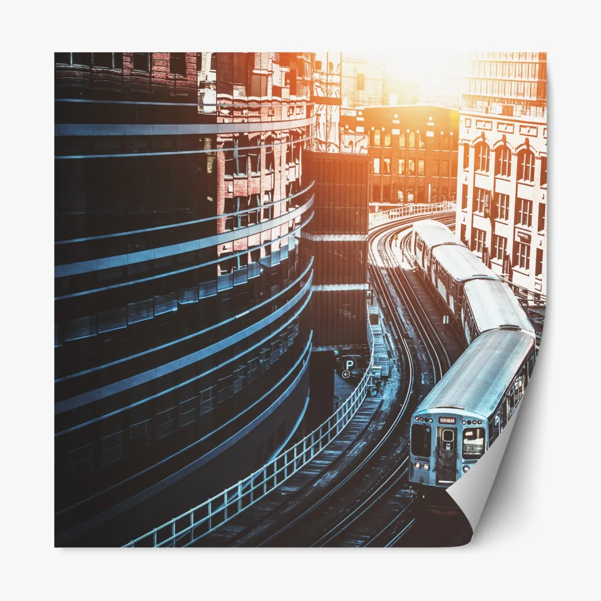 Dynamisches Stadtbild mit einer Hochbahn, die sich im goldenen Licht durch die Innenstadt von Chicago schlängelt, ideal für industrielle und moderne Wohnräume.