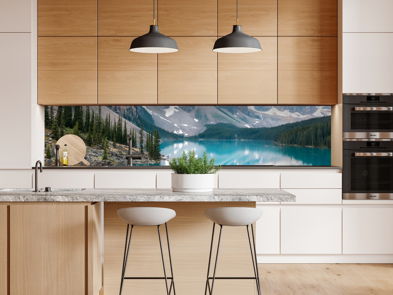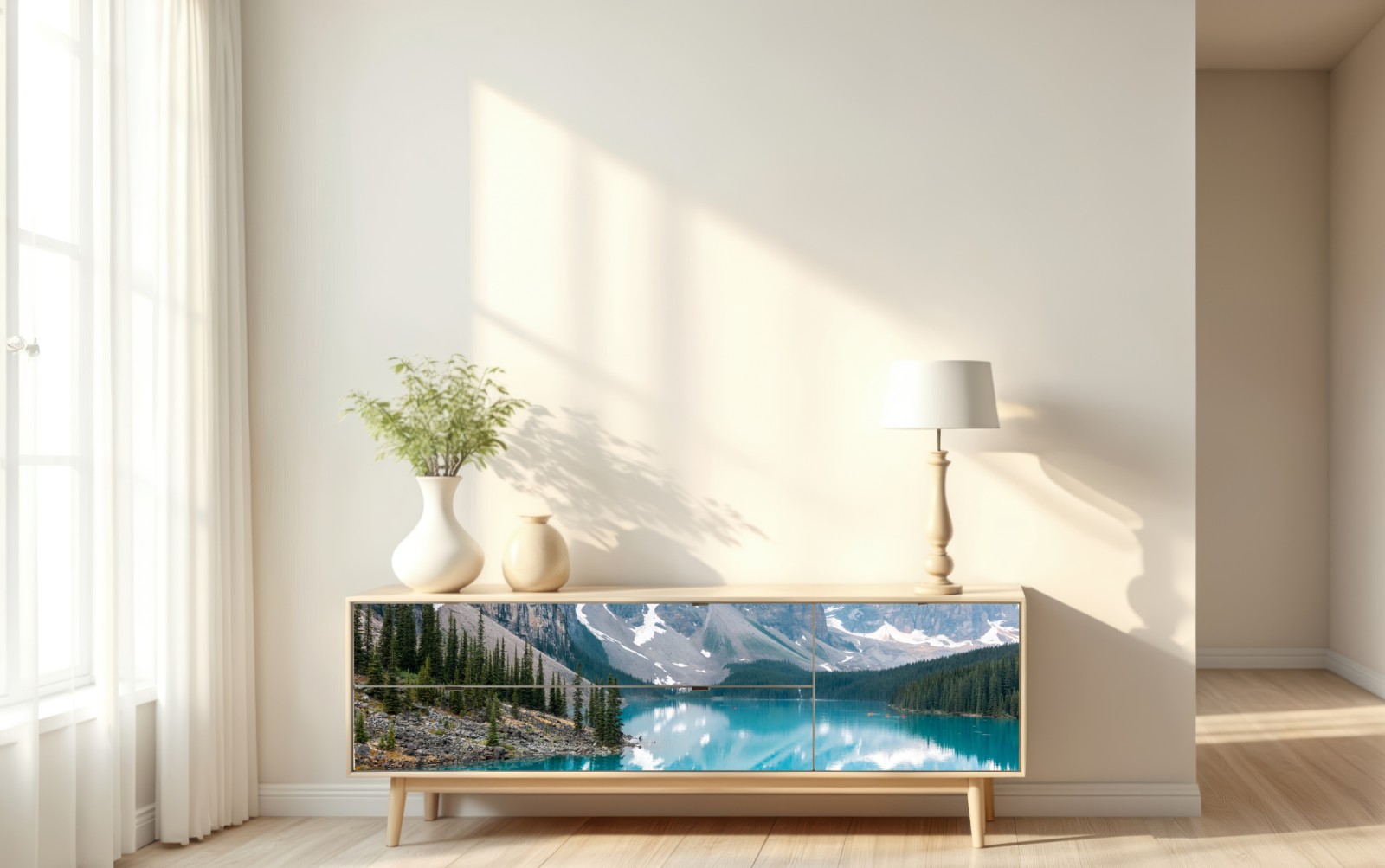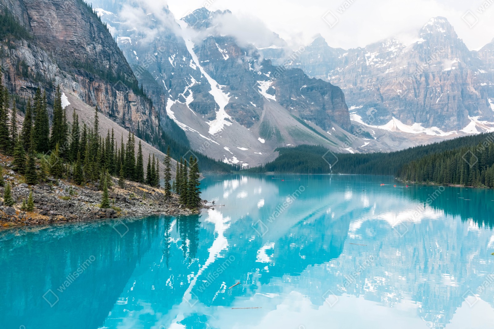 Bringen Sie alpine Ruhe in Ihr Zuhause mit diesem leuchtenden türkisen See, der majestätische Berge und immergrüne Wälder spiegelt.