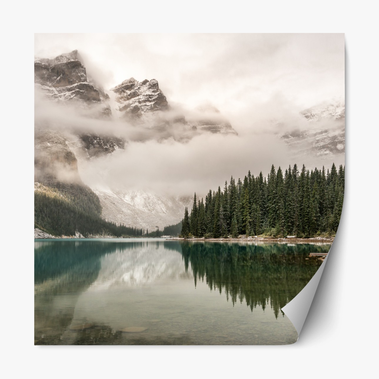 Repositionierbarer Aufkleber Nebliger bergsee mit spiegelung