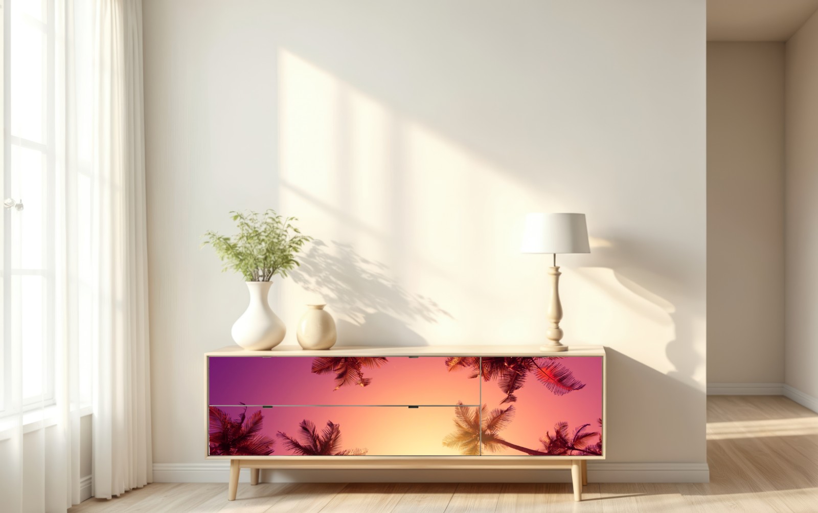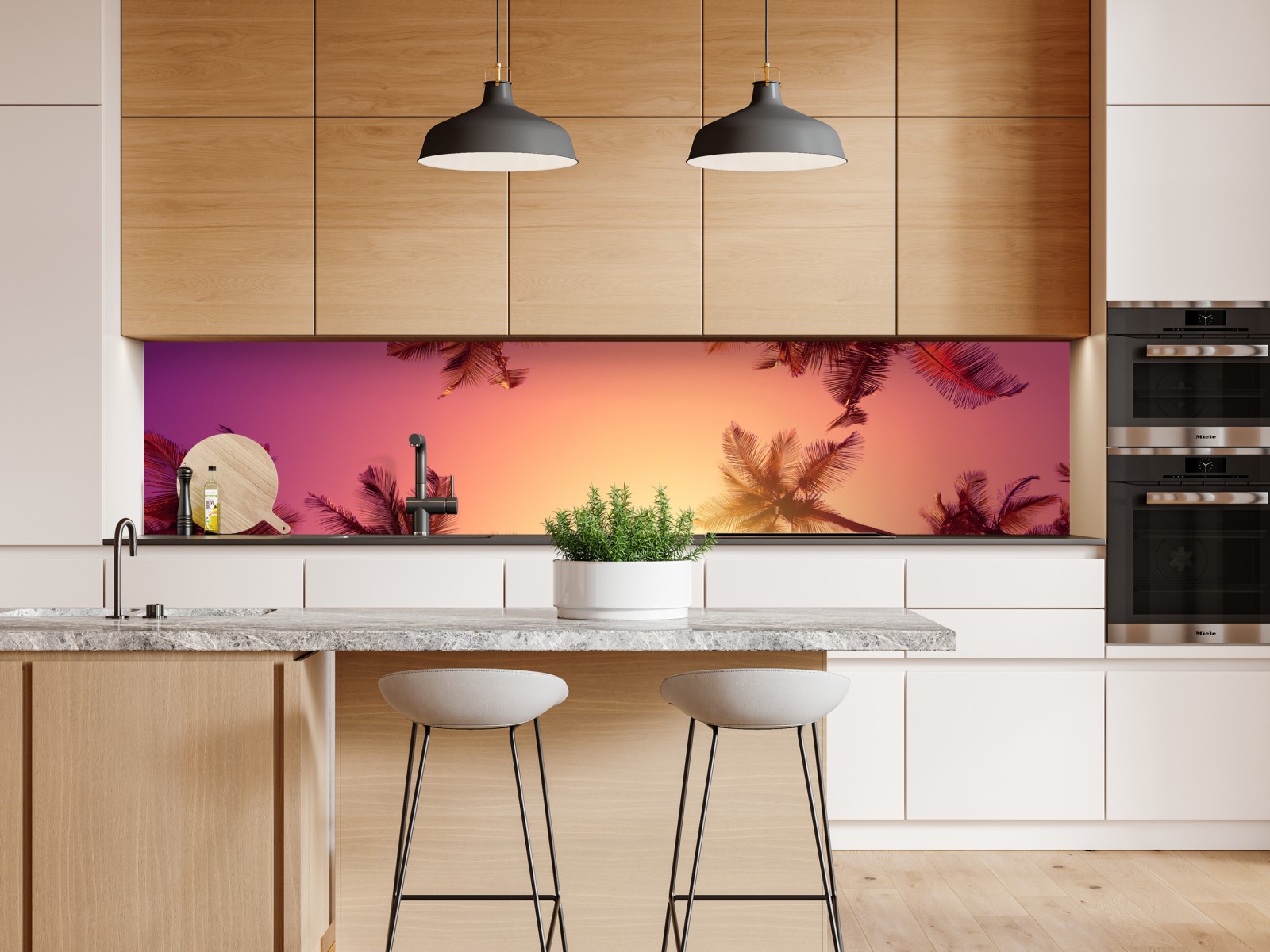 Bringen Sie Inselstimmung in Ihr Zuhause mit diesem lebendigen tropischen Sonnenuntergang mit Palmen-Silhouetten und warmen Farbtönen.