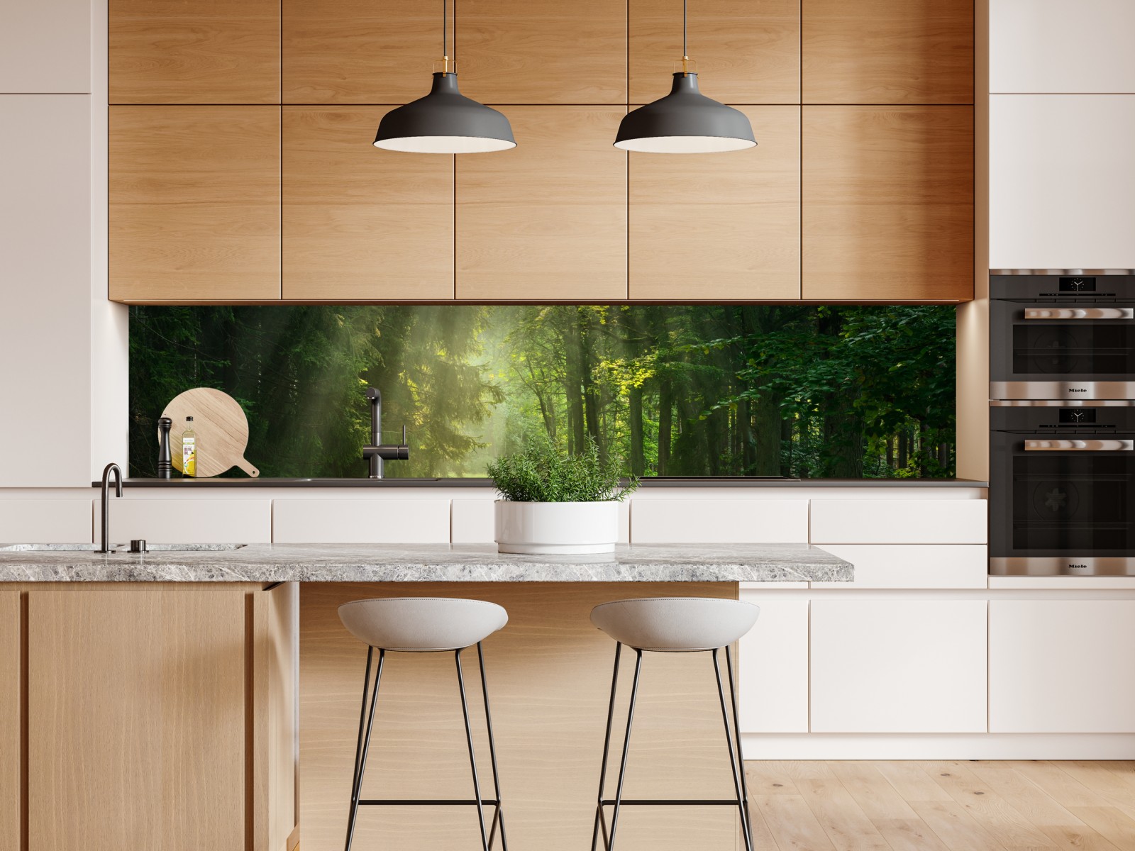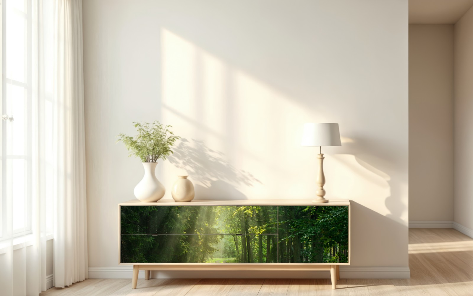 Bringen Sie eine ruhige, natürliche Atmosphäre in jeden Raum mit einem sonnenbeschienenen Waldpfad, in dem Licht durch üppiges grünes Laub fällt.