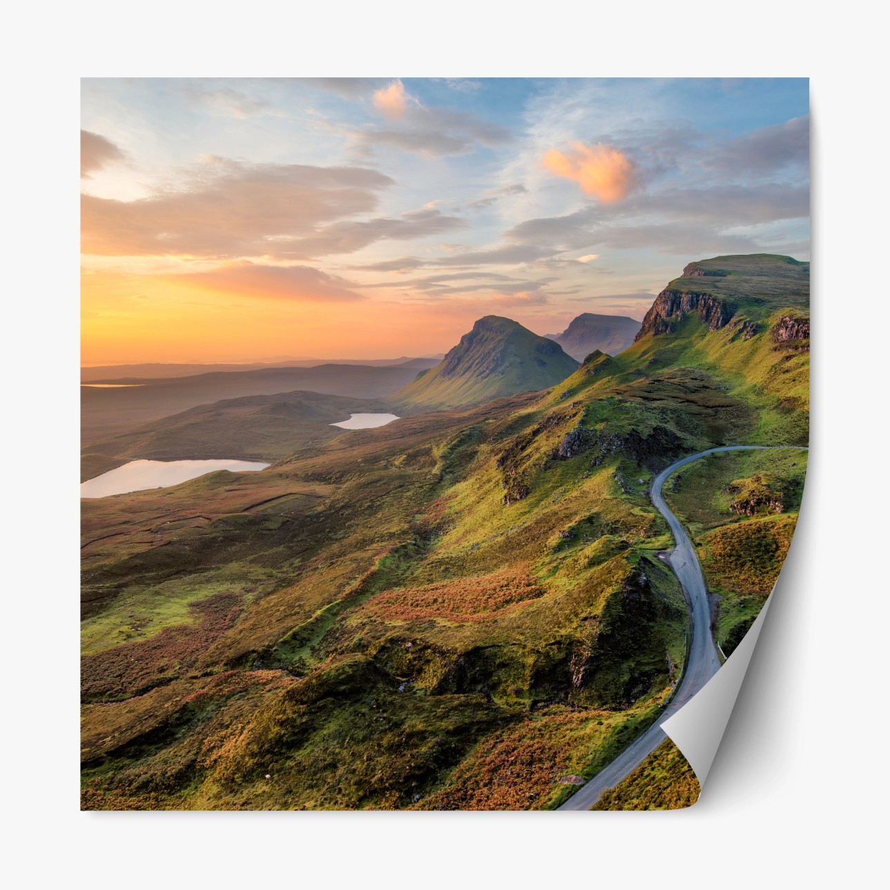 Repositionierbarer Aufkleber Sonnenuntergang über grünen hügeln
