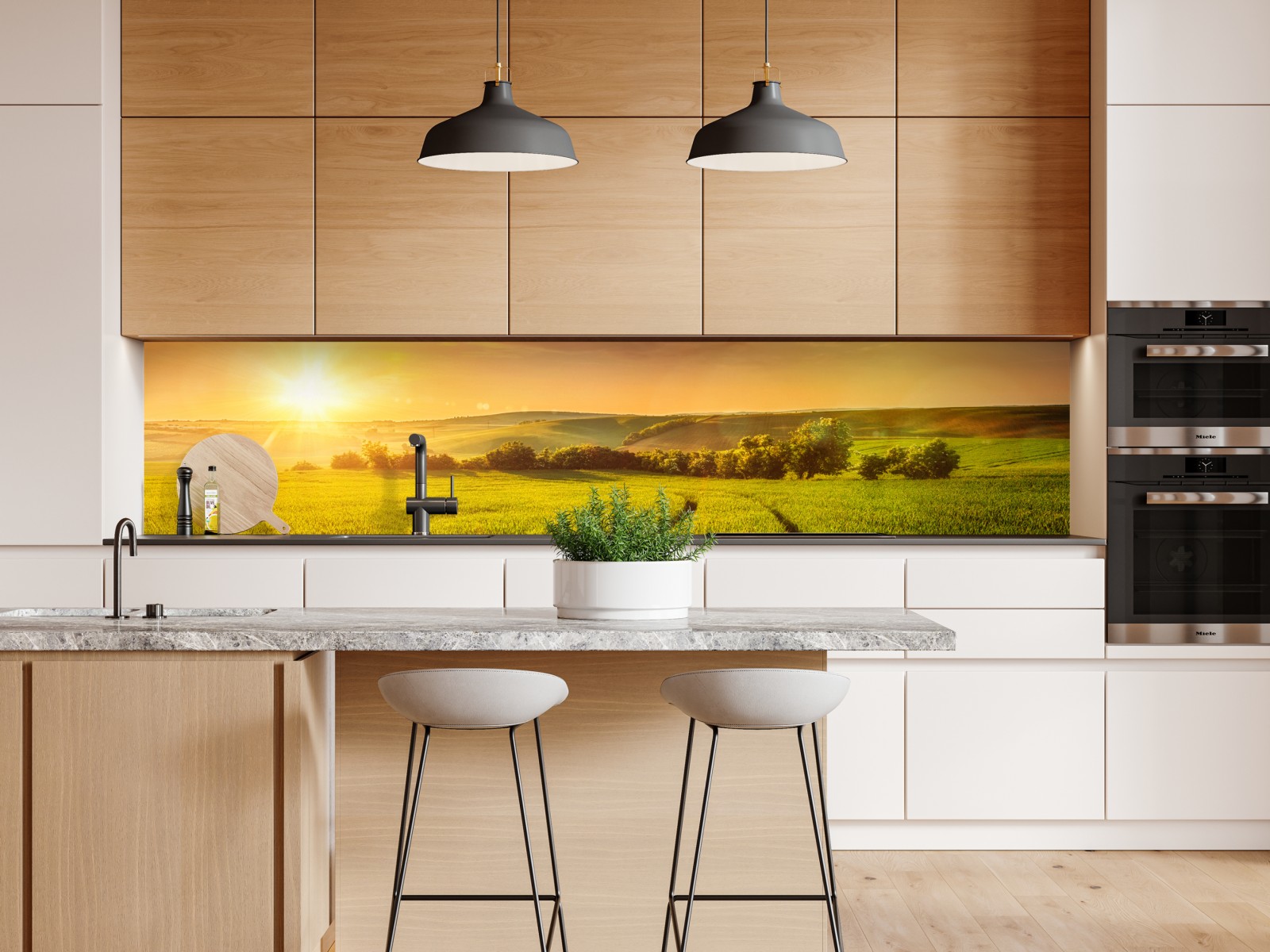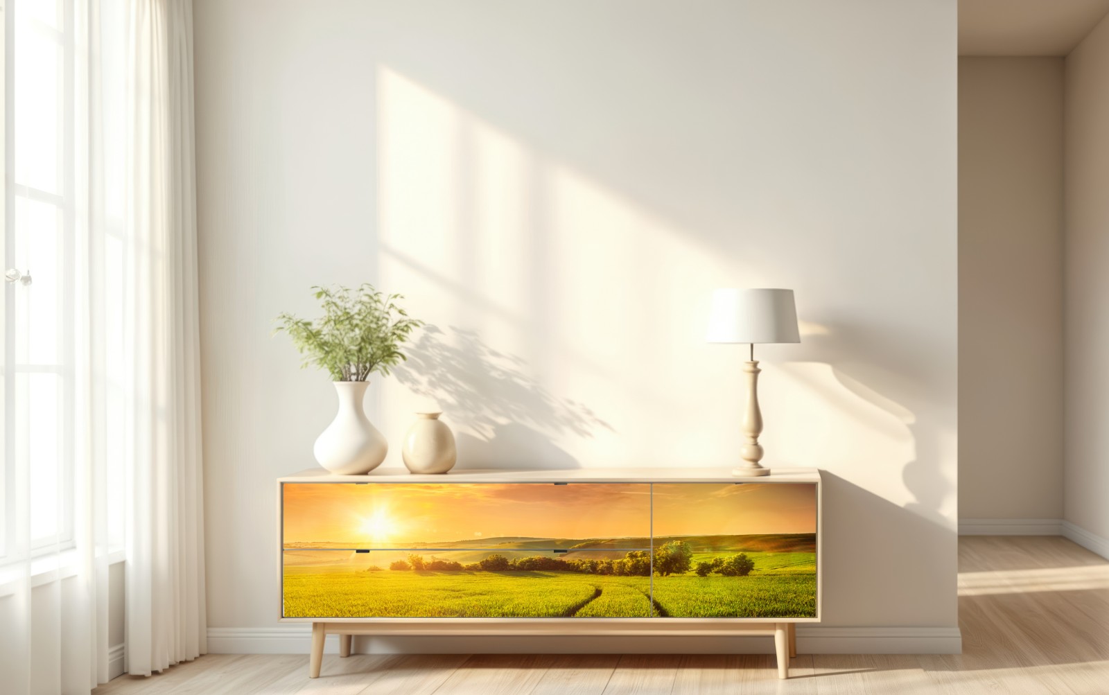 Bringen Sie Wärme und Ruhe in Ihr Zuhause mit dieser idyllischen Wiese im warmen Abendlicht.