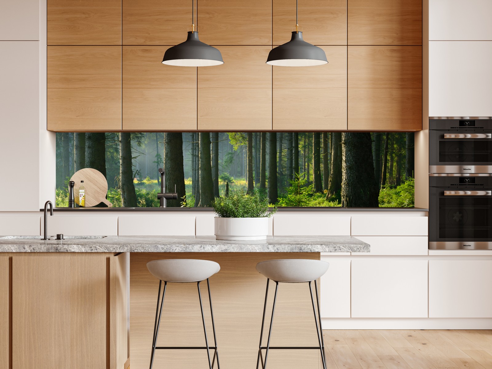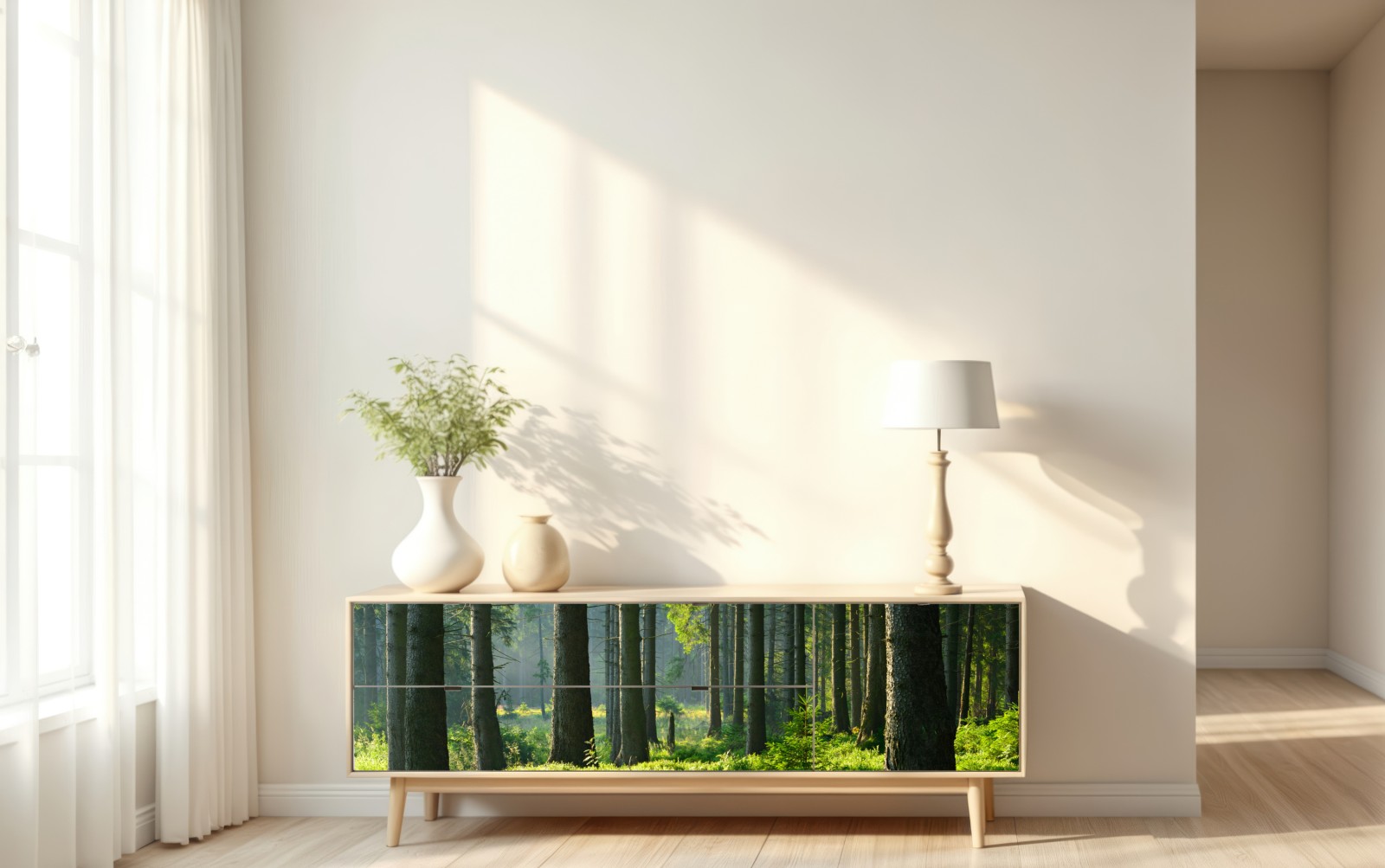 Eine ruhige, sonnendurchflutete Waldlichtung, die die Ruhe der Natur ins Zuhause bringt. Üppiges Grün, Moos und hohe Kiefern schaffen eine entspannte Atmosphäre zum Abschalten.