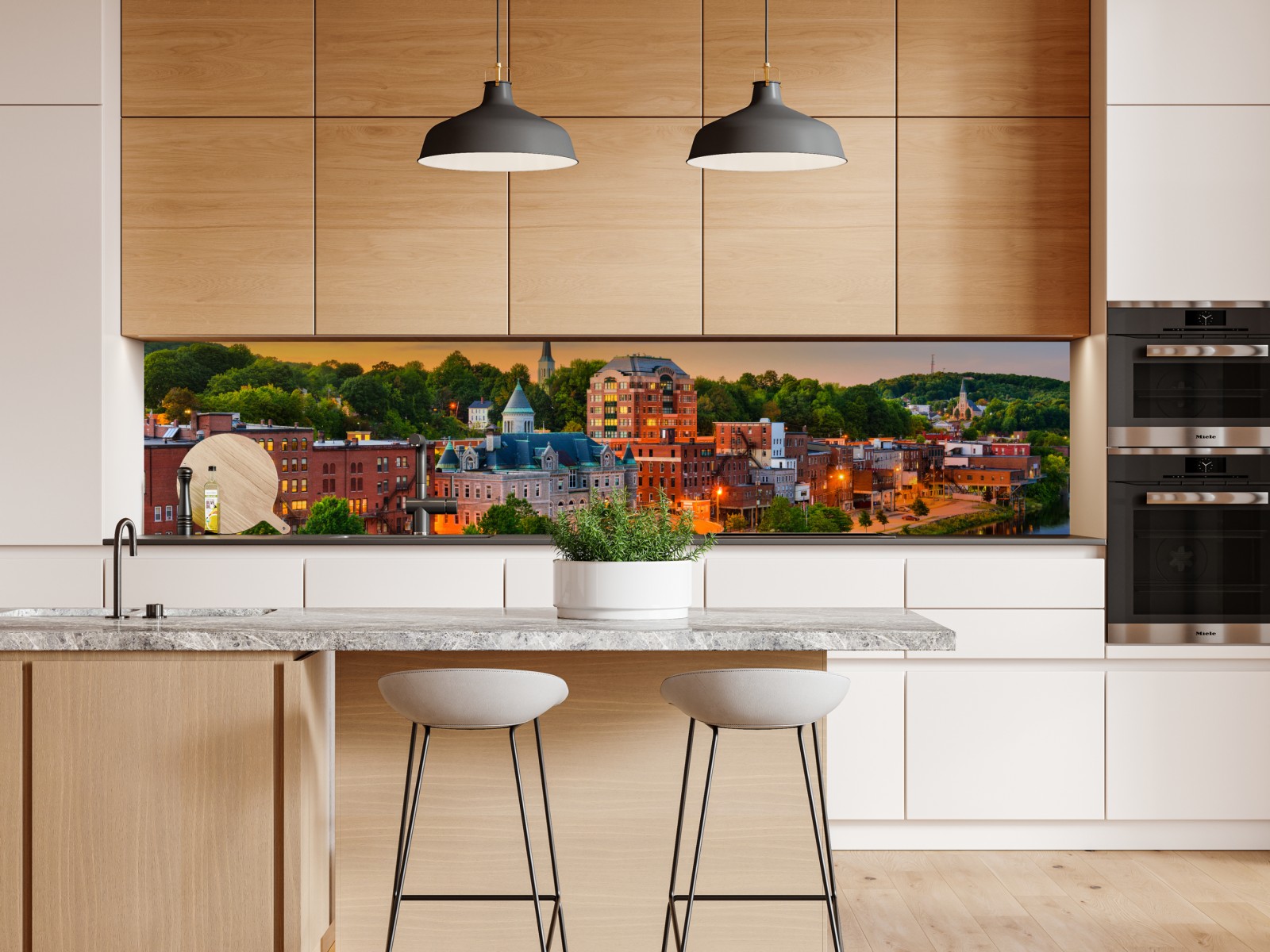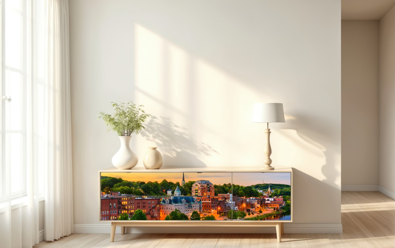 Lebhafte Panoramaansicht der Innenstadt von Augusta am Kennebec River bei Sonnenuntergang, ideal zur Dekoration mit urbanem Flair.