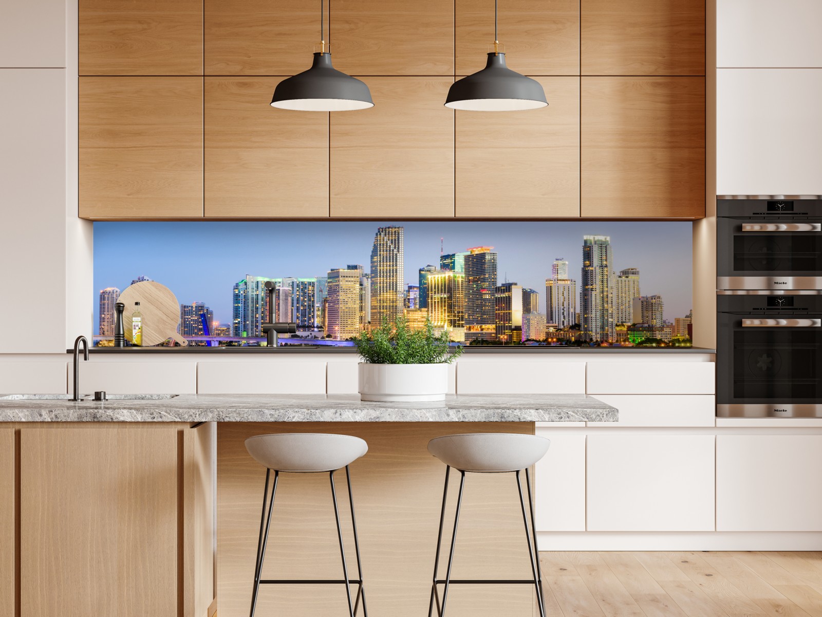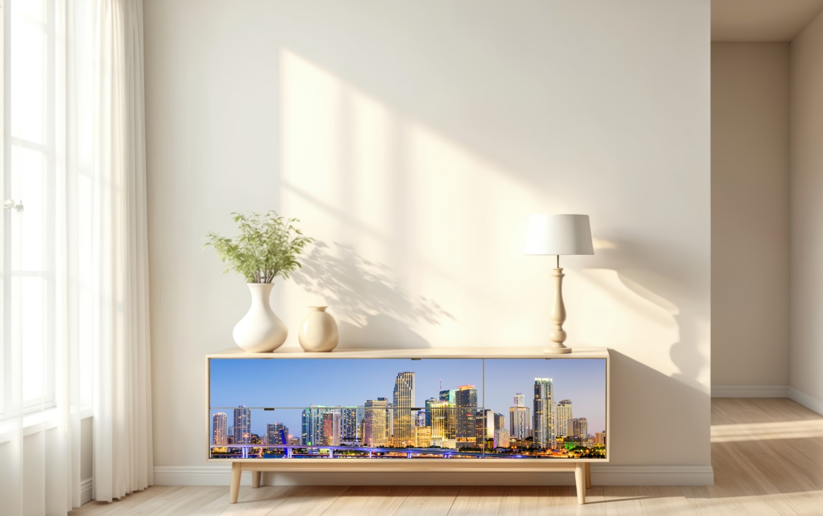 Lebendige Panoramaaufnahme der Innenstadt von Miami bei Dämmerung mit schimmernden Reflexionen und modernen Wolkenkratzern, die urbanes Flair in Ihr Zuhause bringen.