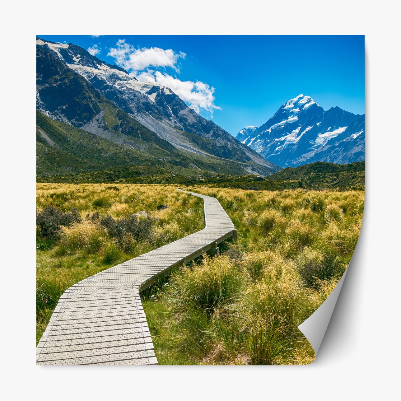 Repositionierbarer Aufkleber Holzsteg durch wiesen zu schneebedeckten gipfeln