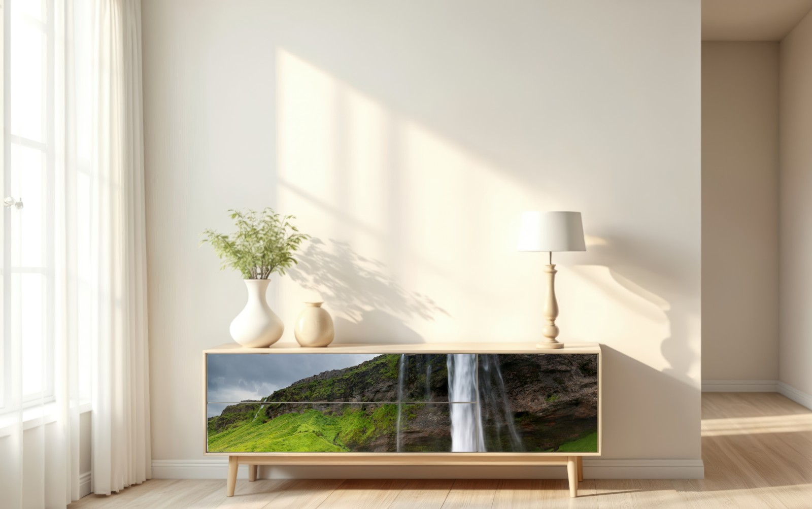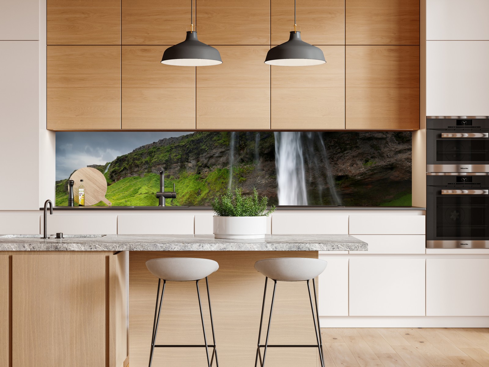 Dramatische Ansicht des Wasserfalls Seljalandsfoss eingerahmt von satten grünen Klippen und stimmungsvollem Himmel, ideal um natürliche Energie in den Raum zu bringen.