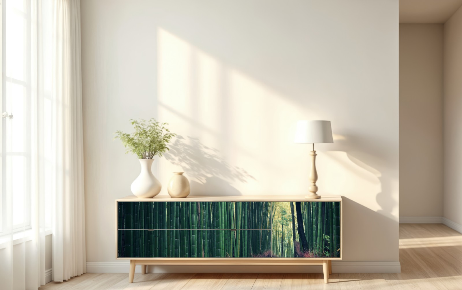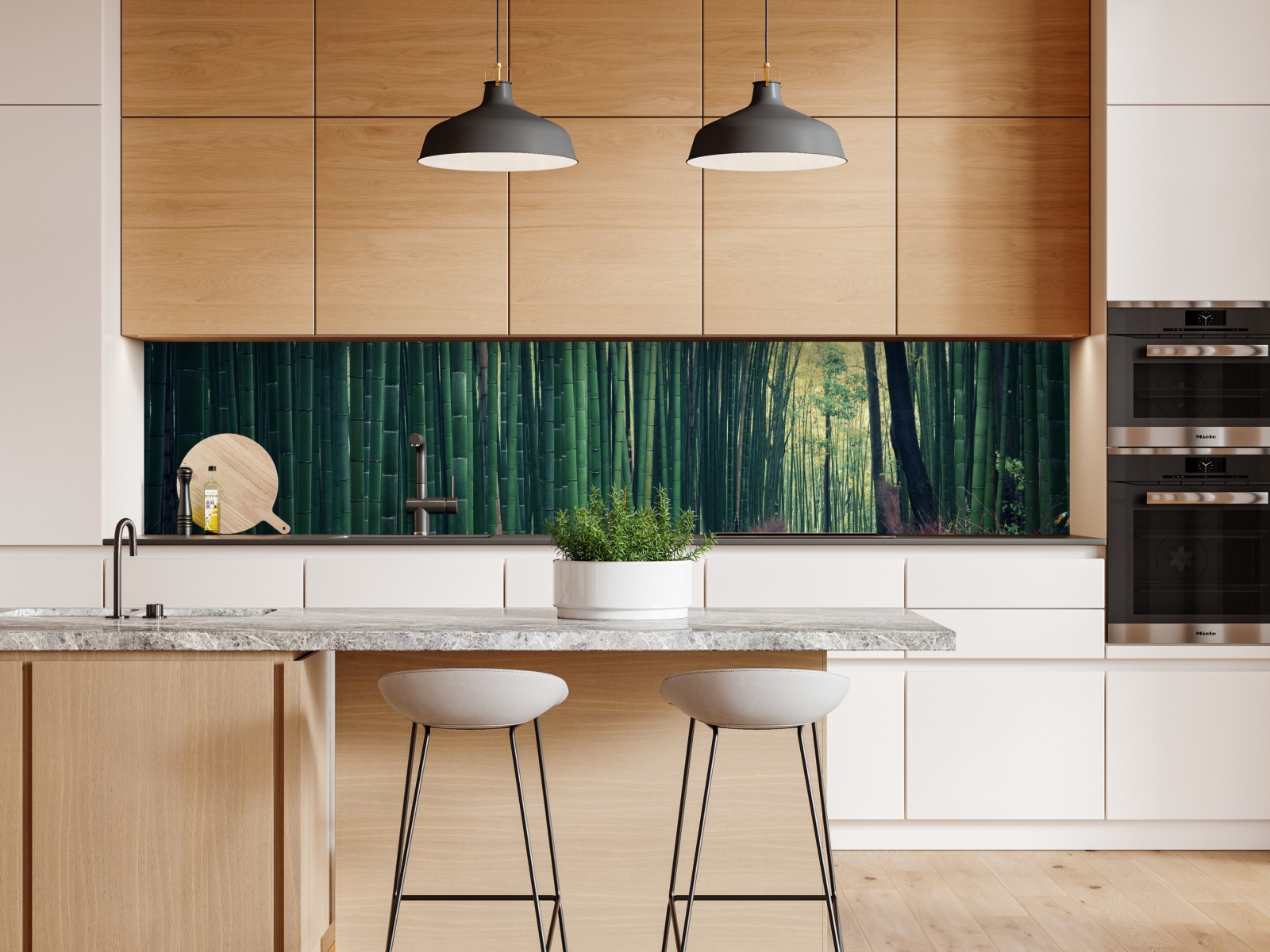 Bringen Sie die beruhigende Atmosphäre eines japanischen Bambuswaldes in Ihren Raum mit diesem Blick auf einen Pfad in Arashiyama, Kyoto.
