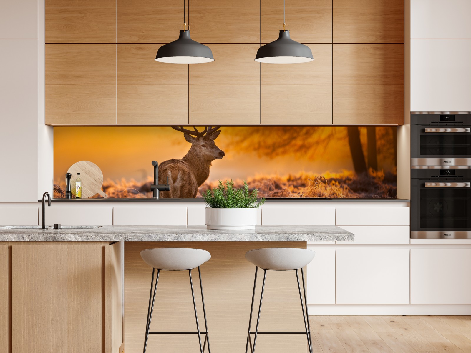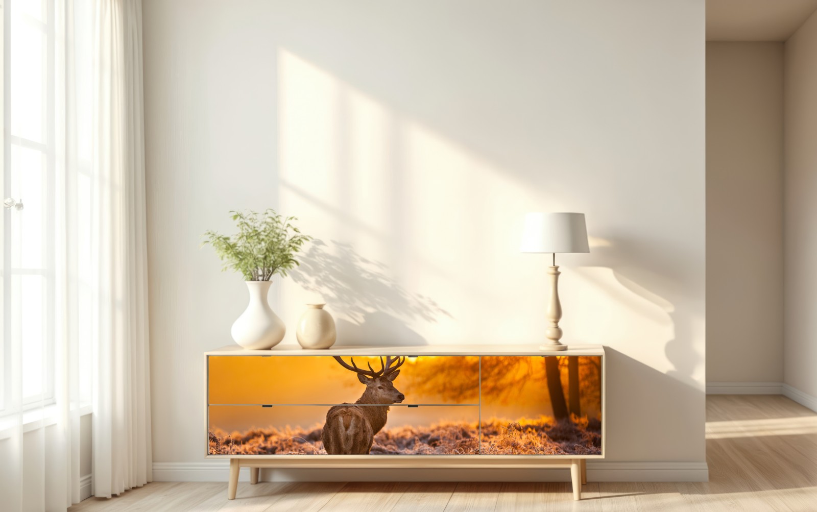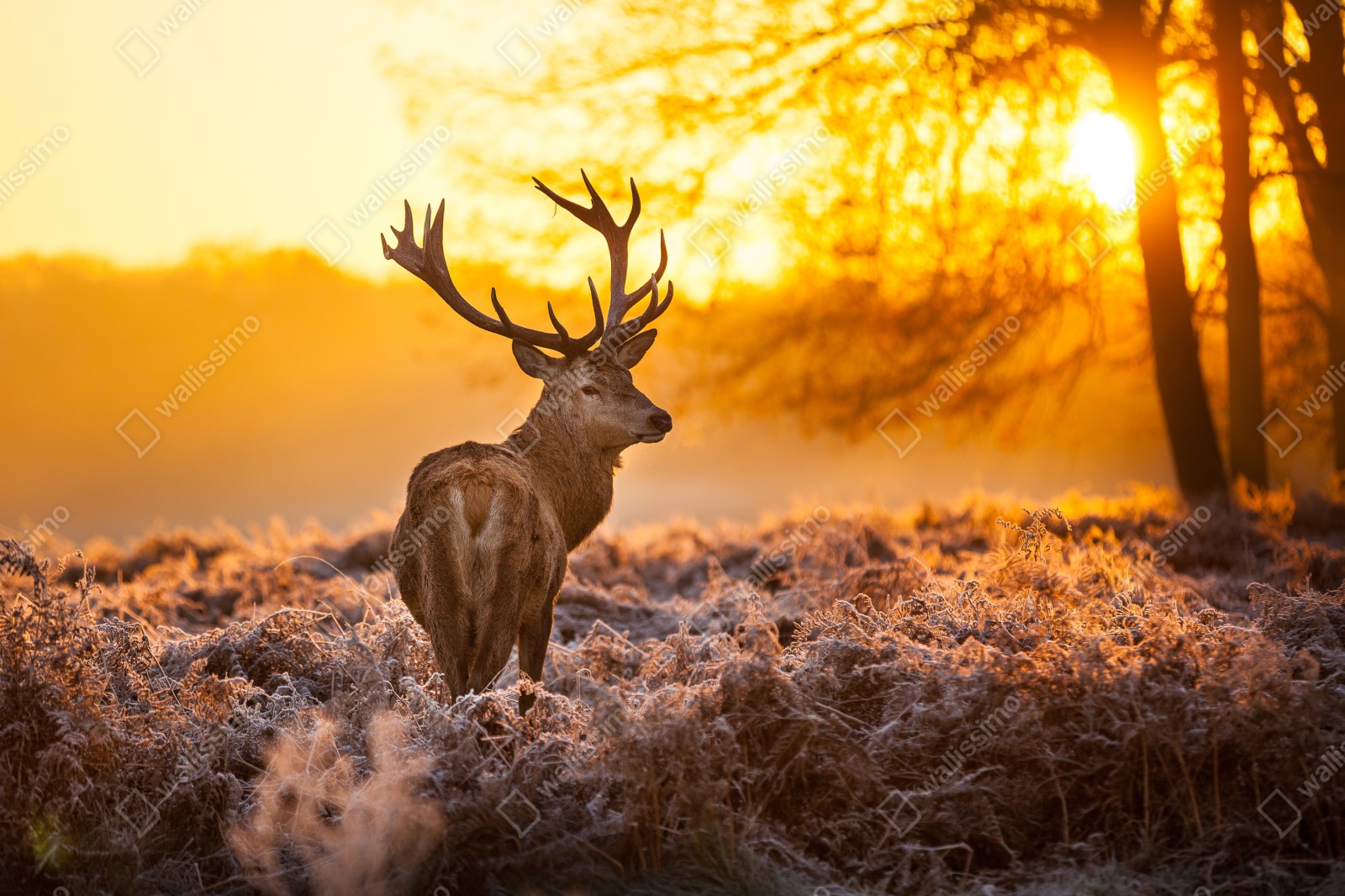 ein beeindruckendes naturfoto eines hirschs im goldenen licht des sonnenaufgangs, perfekt um ruhe und natur in ihr zuhause zu bringen.