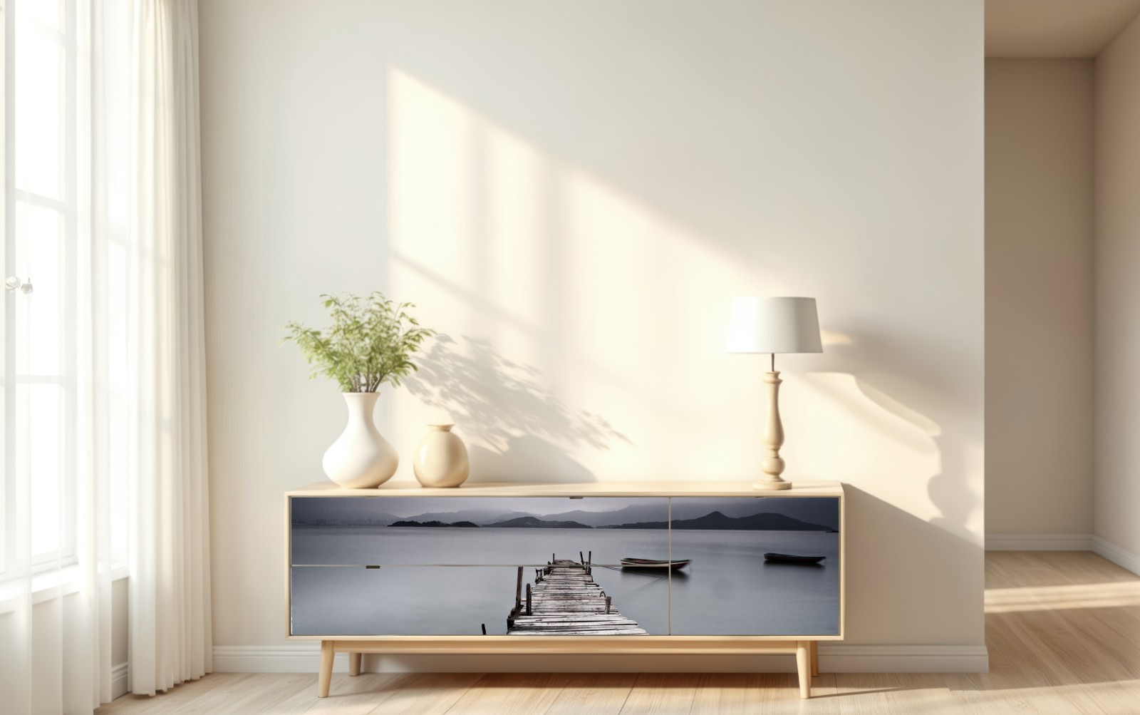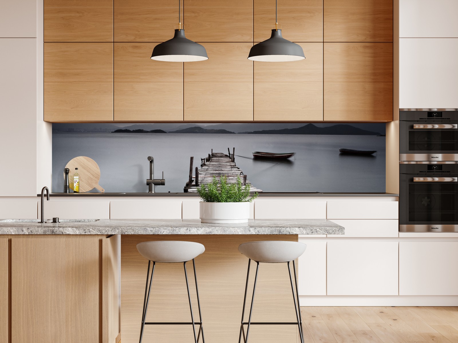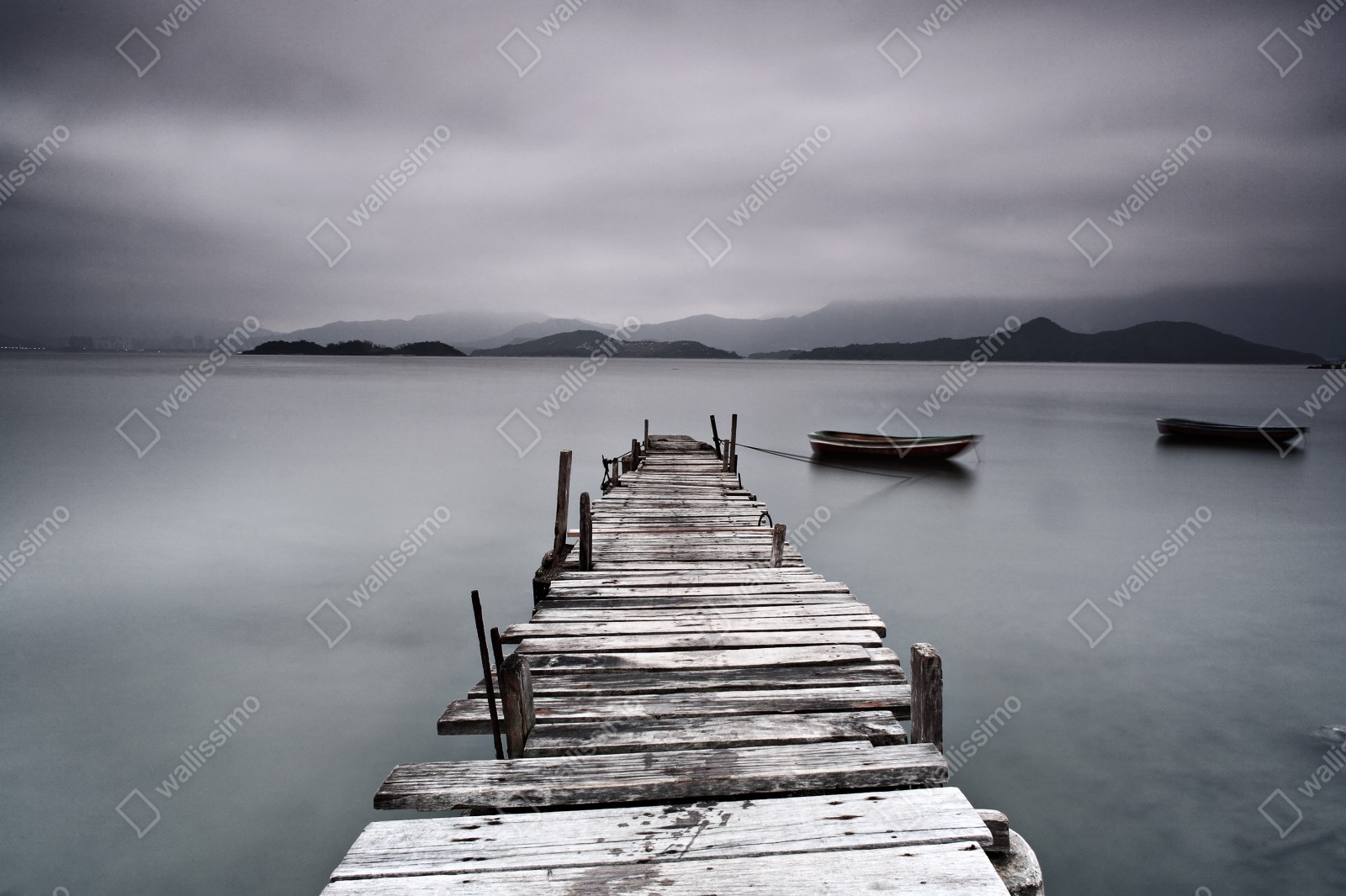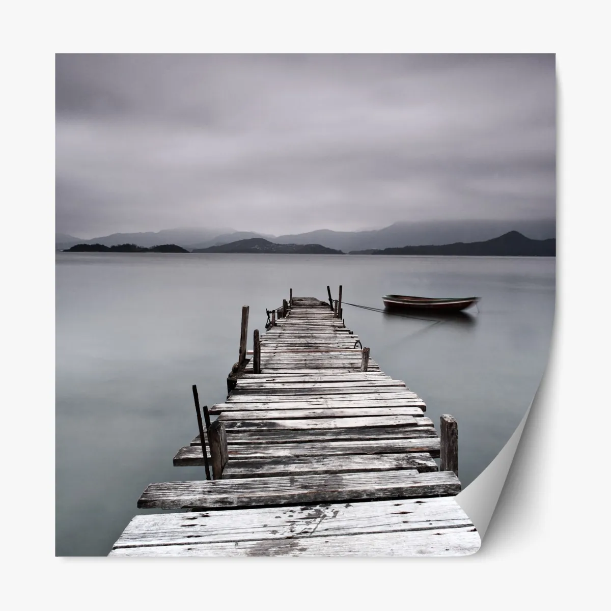 Ein ruhiges Langzeitbelichtungs-Meeresbild mit einer verwitterten Holzseebrücke und festgemachten Booten in gedämpften Grautönen, perfekt um Ihrem Raum Ruhe zu verleihen.
