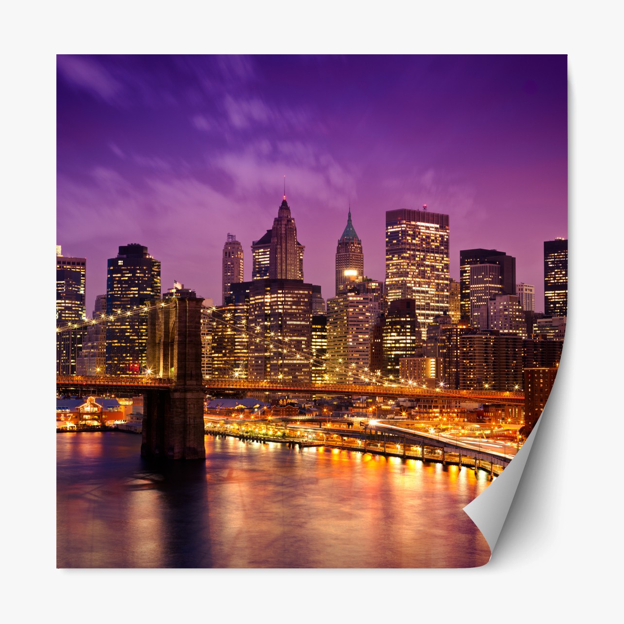Repositionierbarer Aufkleber Violette skyline über leuchtender stadt und brücke