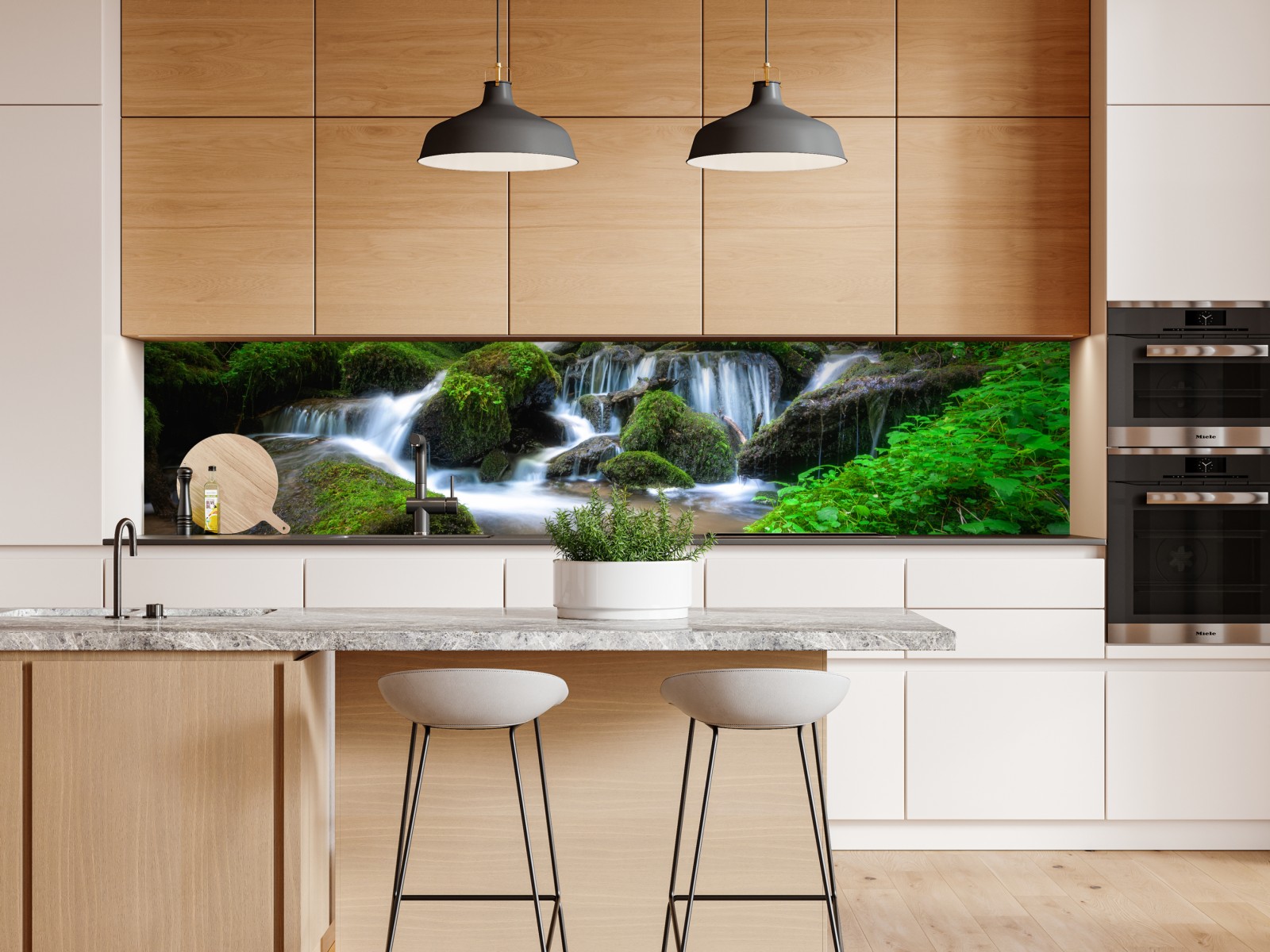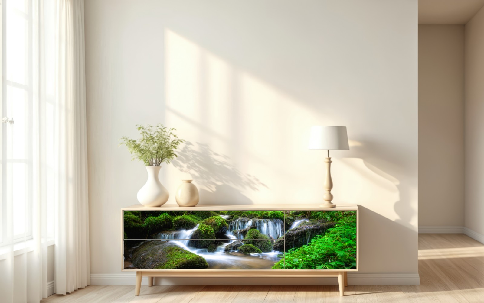 Bringen Sie die beruhigende Atmosphäre eines moosbedeckten Waldwasserfalls in Ihr Zuhause mit intensiven Grüntönen und sanftem Wasserrauschen.