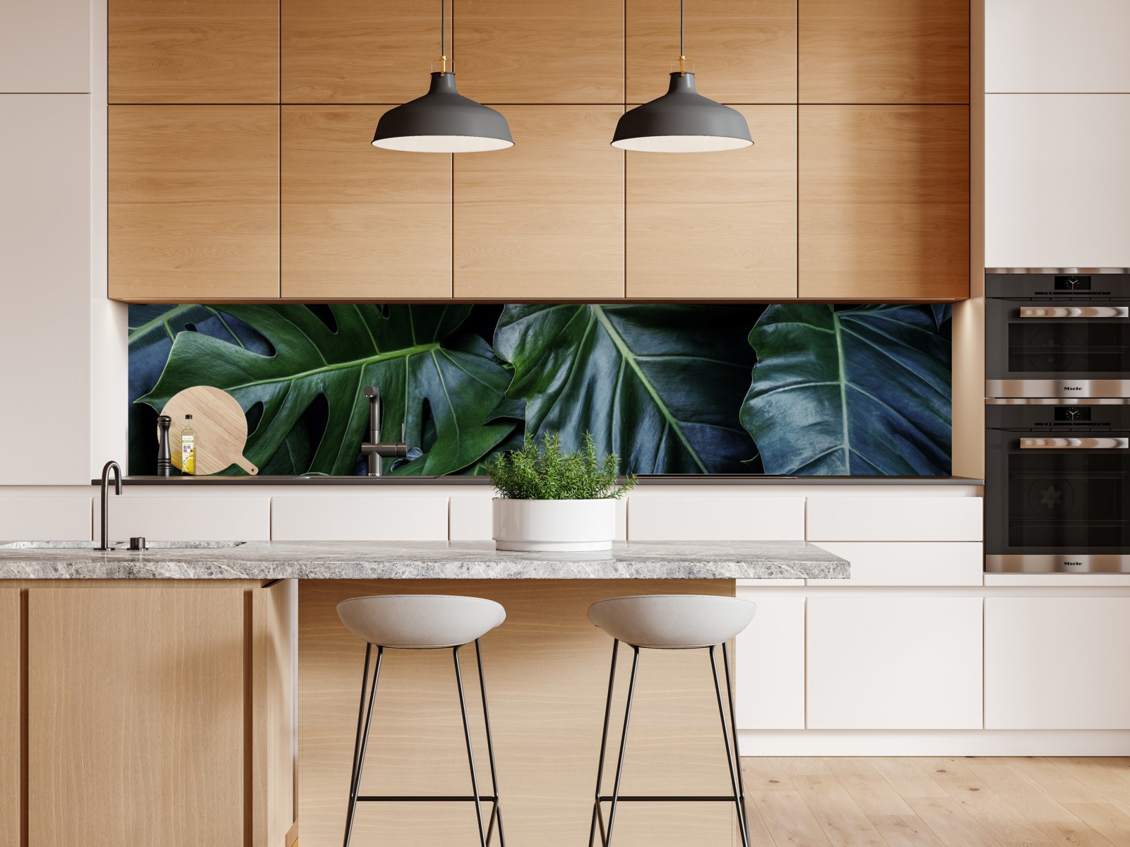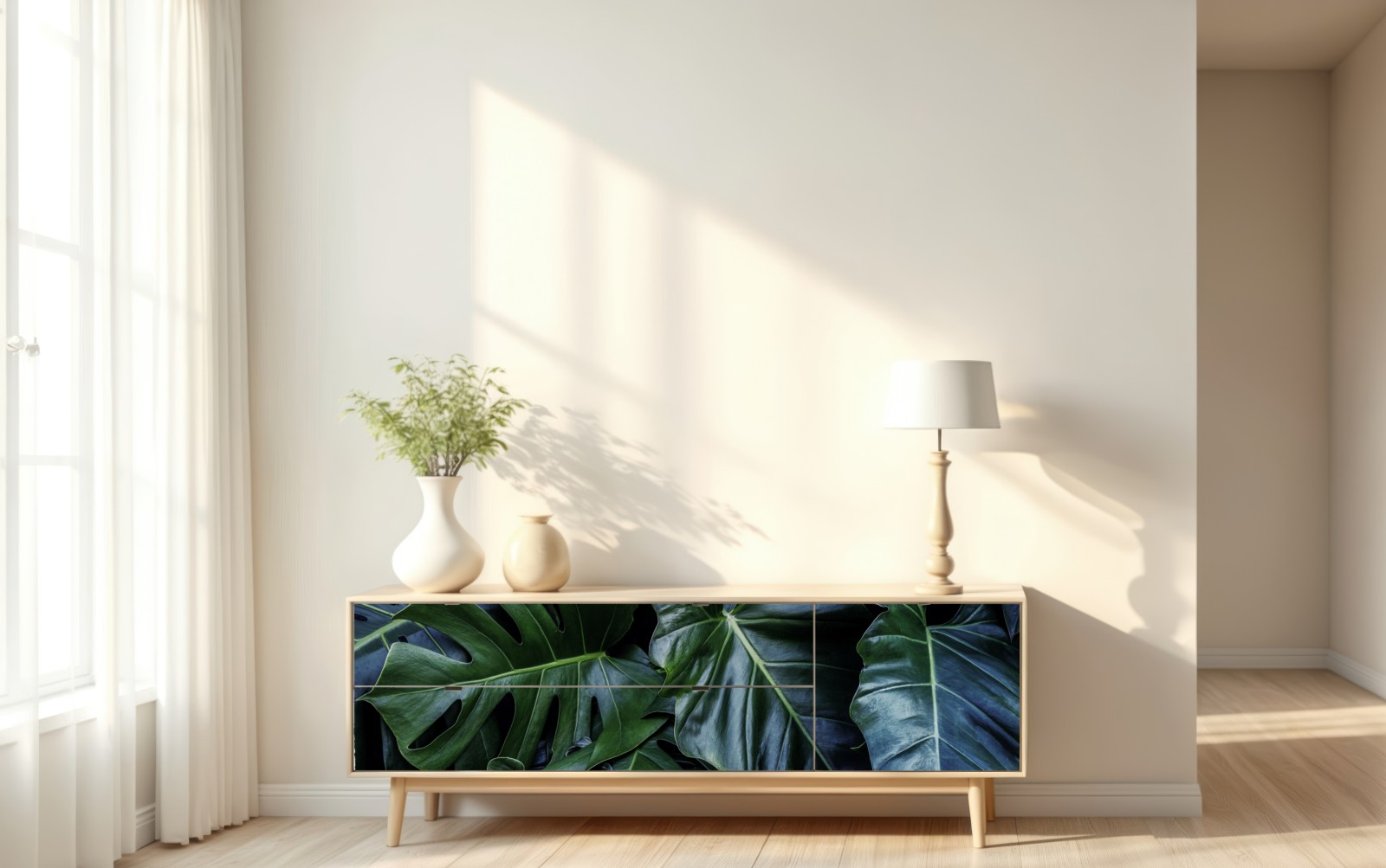 Tief smaragdgrüne tropische Blätter schaffen ein beruhigendes, naturnahes Statement und bringen üppiges Grün in jeden Raum.