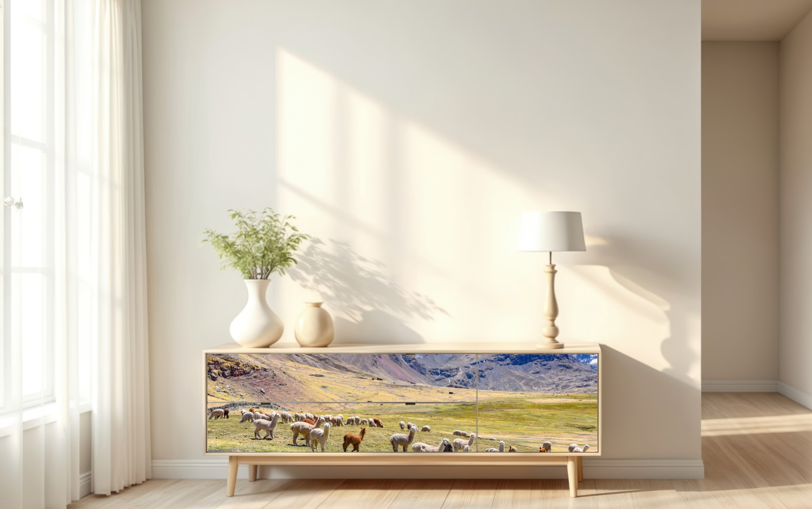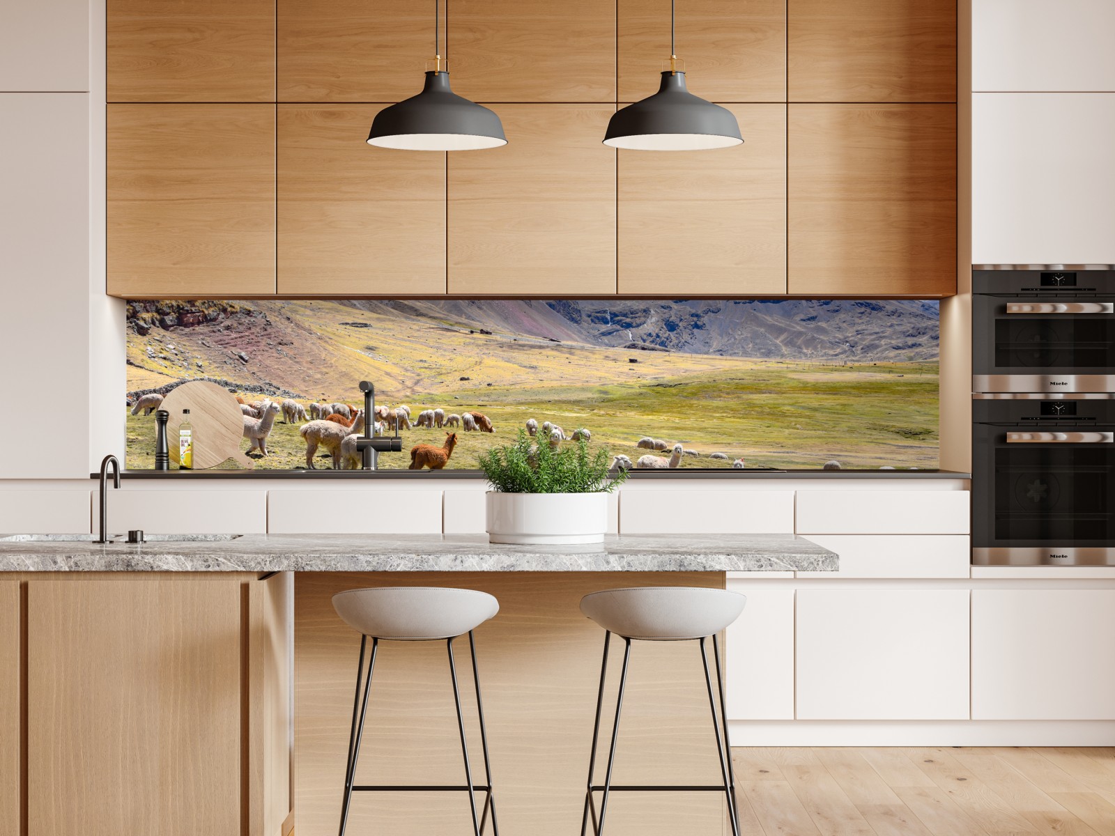 Eine ruhige Hochlandszene mit Alpakas und Lamas, die unter dem schneebedeckten Mt Ausangate in Cusco, Peru grasen — ideal, um natürliche Ruhe in jeden Raum zu bringen.