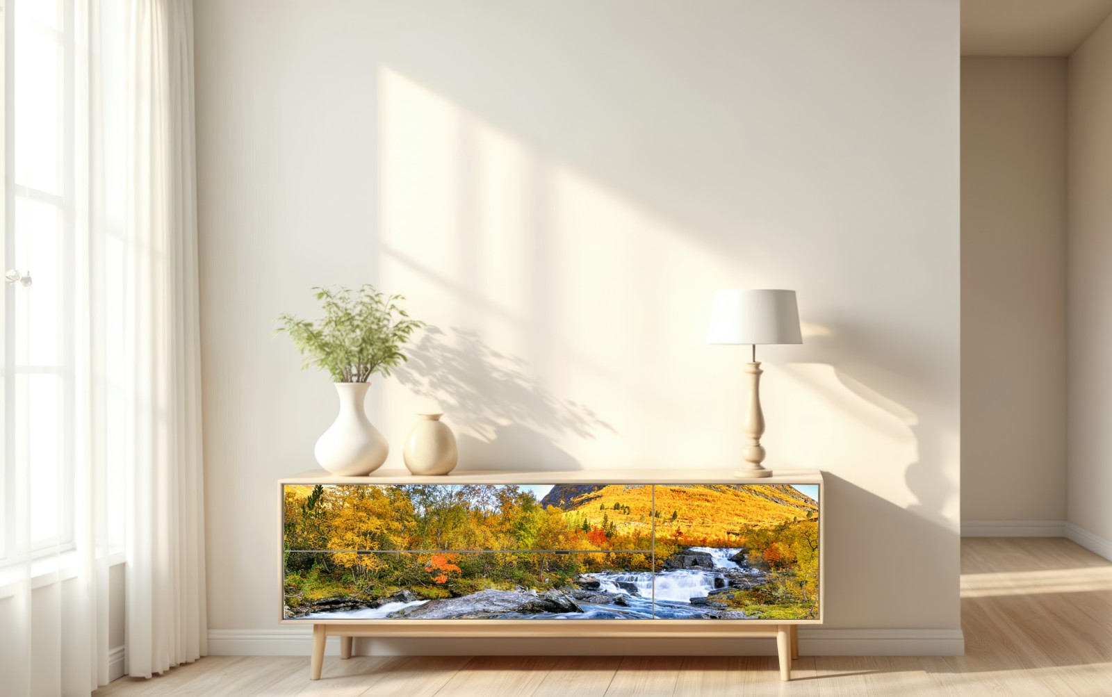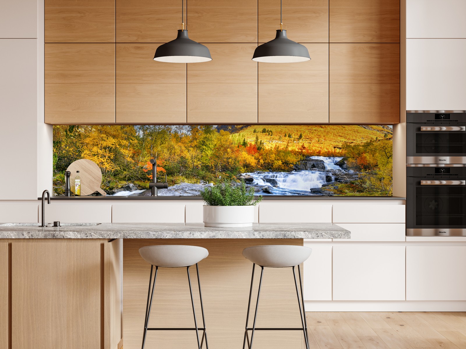 Lebendige herbstliche Wasserfalllandschaft bringt warme Farben und beruhigende Bewegung an Ihre Wände.
