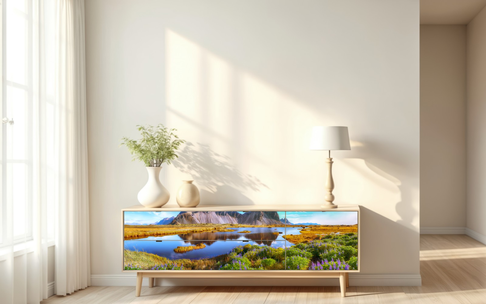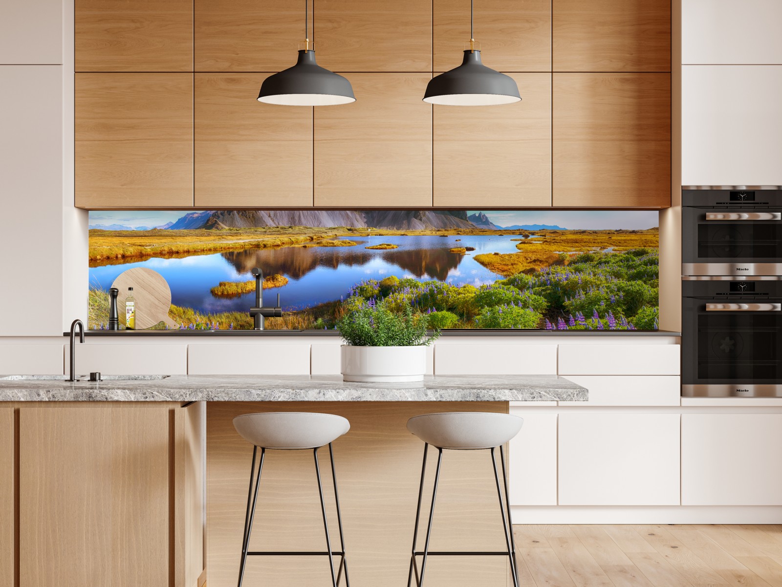 Erleben Sie die klare Schönheit Islands mit dieser lebendigen Panoramaaufnahme von Lupinen, spiegelnden Lagunen und den markanten Vestrahorn-Gipfeln unter blauem Himmel.