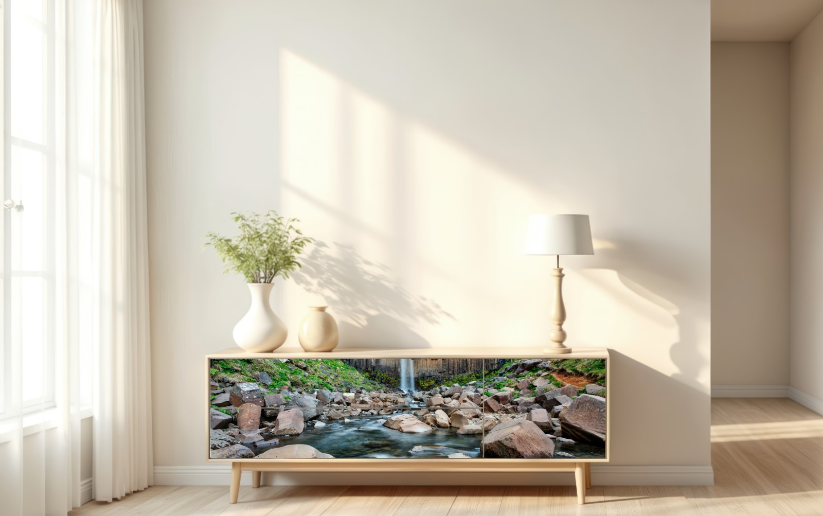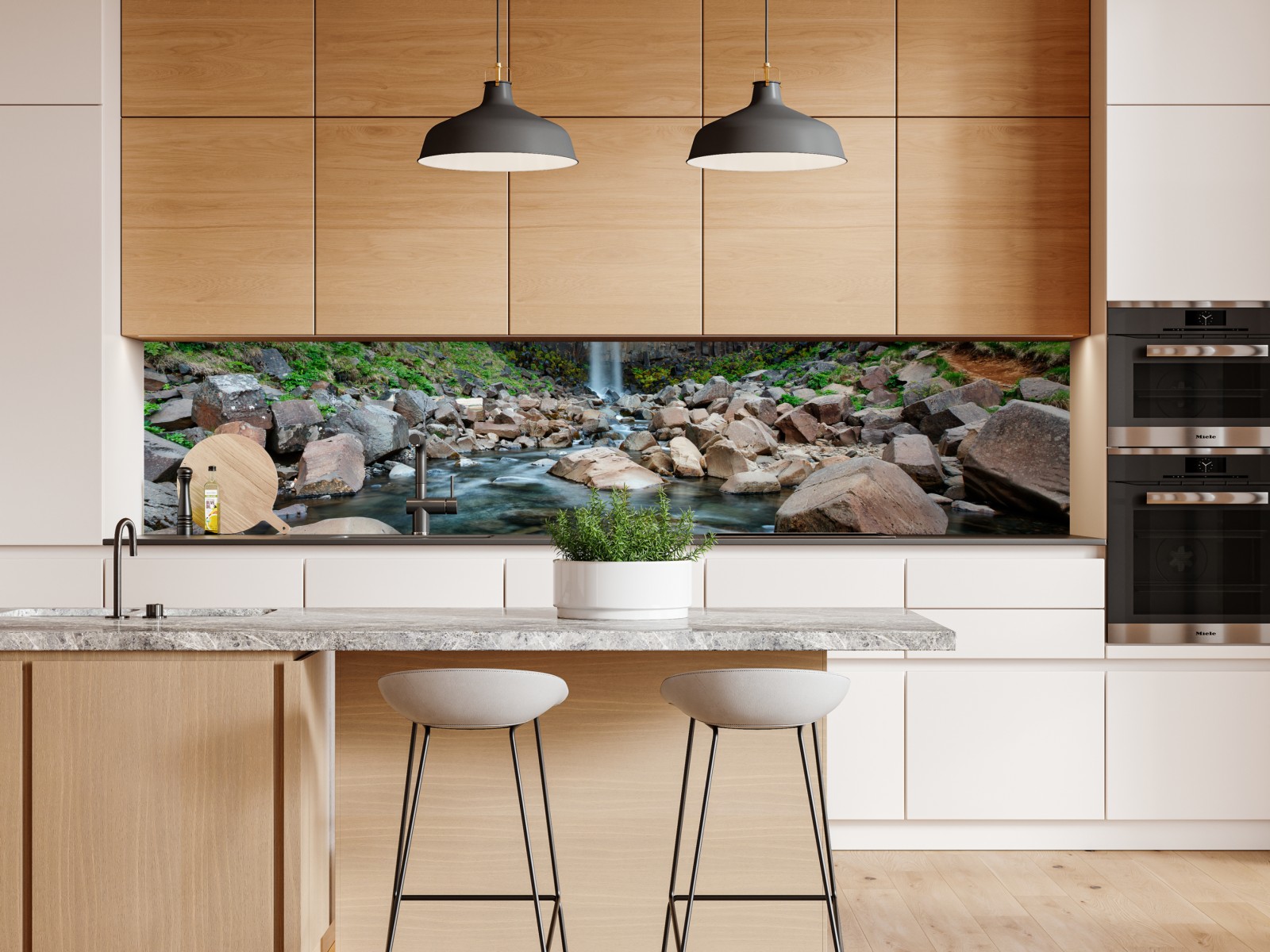 ein dramatischer wasserfall eingerahmt von sechseckigen basaltsäulen und einem wilden flusslauf, der natürliche schönheit in jeden raum bringt.