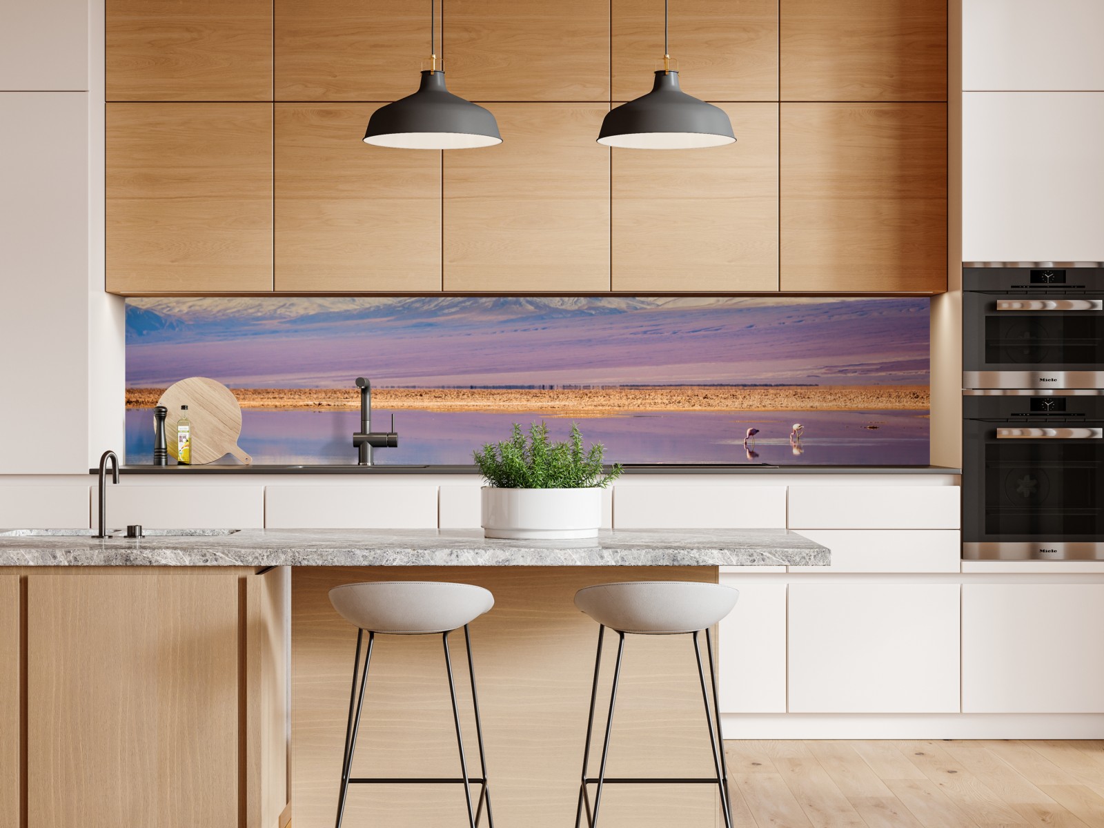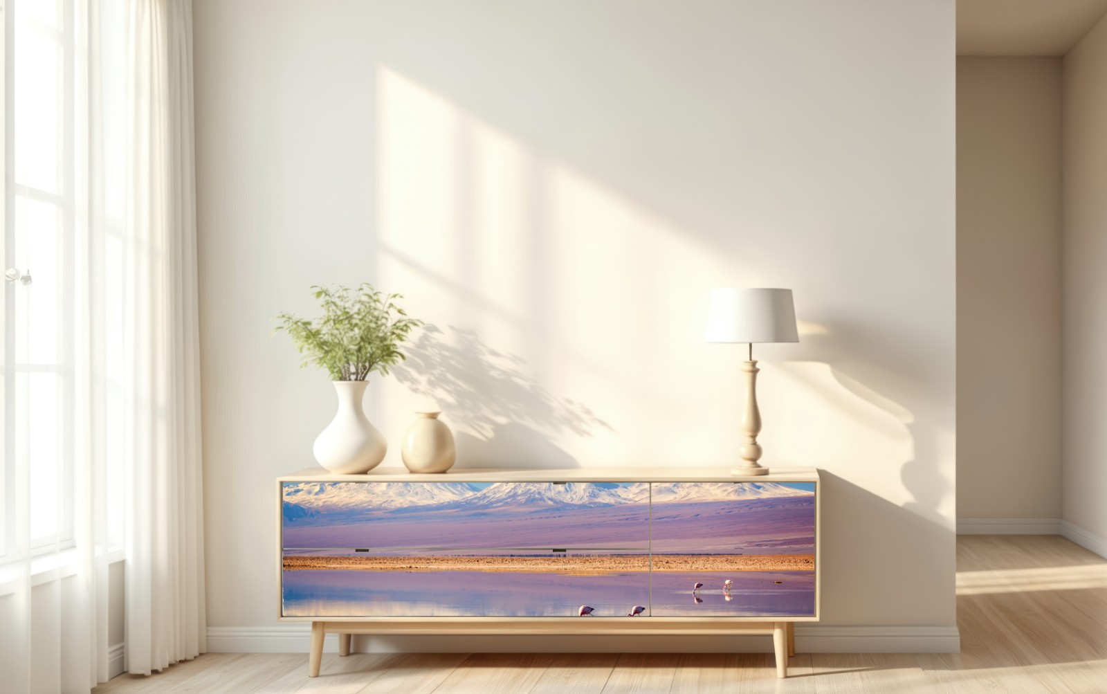 Ruhige Landschaftsaufnahme der Laguna Chaxa mit andinen Flamingos im spiegelglatten Wasser und dem schneebedeckten Licancabur im Hintergrund, ideal zur Gestaltung natürlicher Wohnräume.