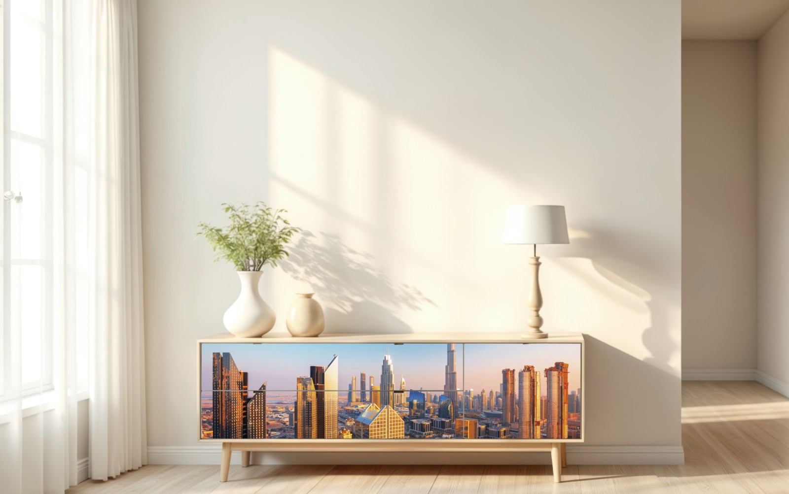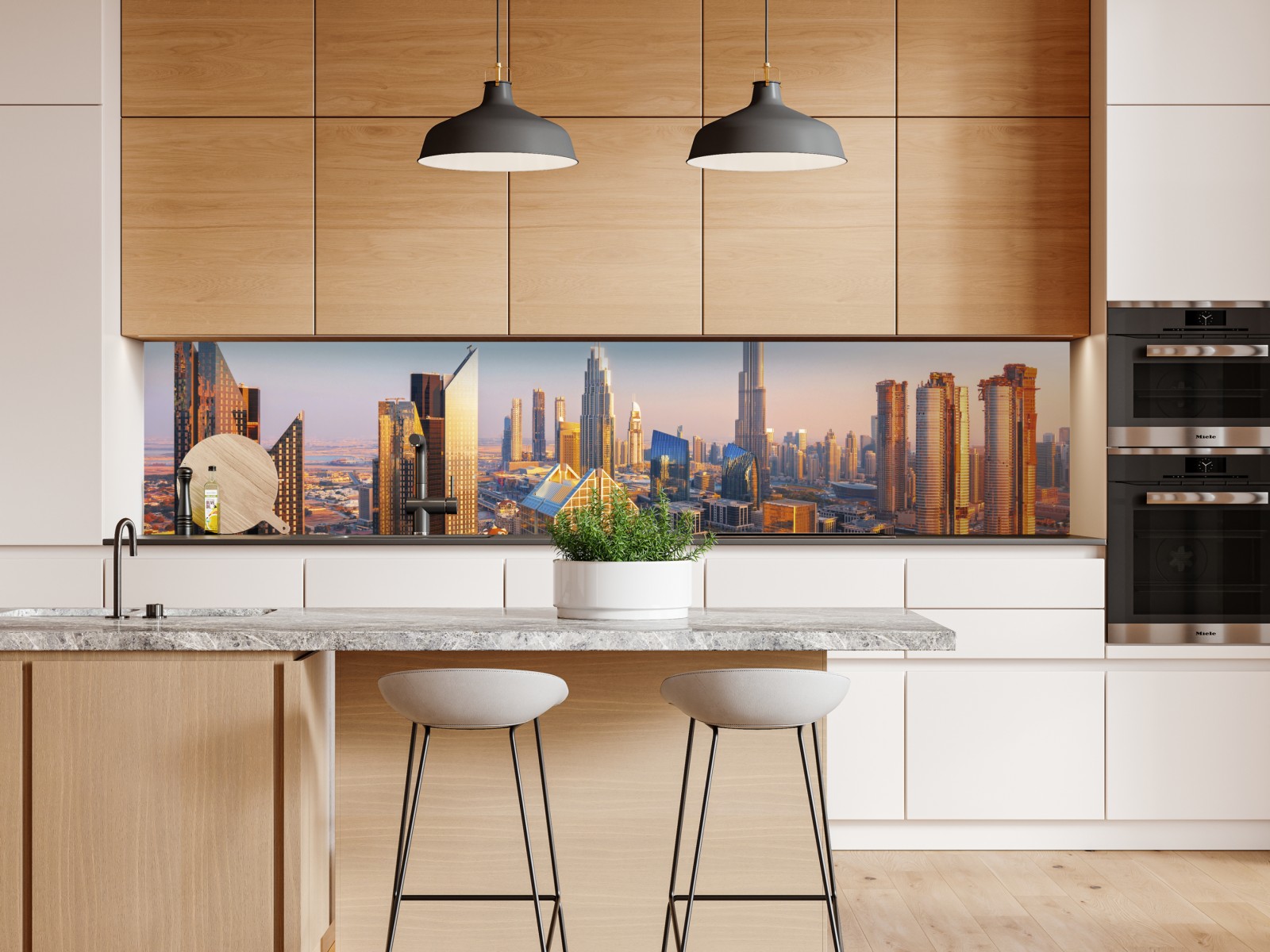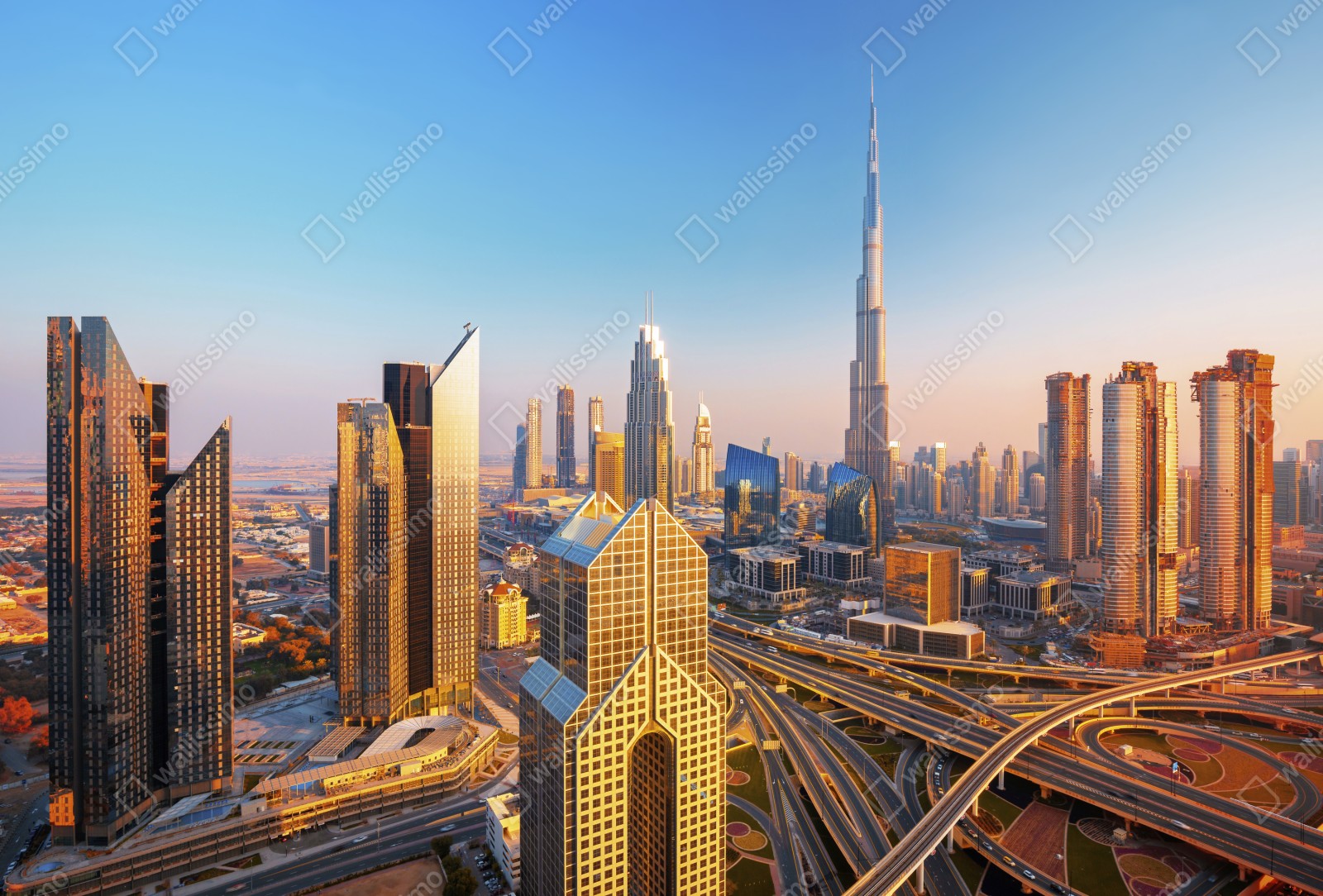 Beeindruckende Luftaufnahme der Dubai-Skyline mit dem ikonischen Burj Khalifa und weitläufigen Autobahnen im warmen Abendlicht, perfekt um modernen urbanen Charakter in jeden Raum zu bringen.