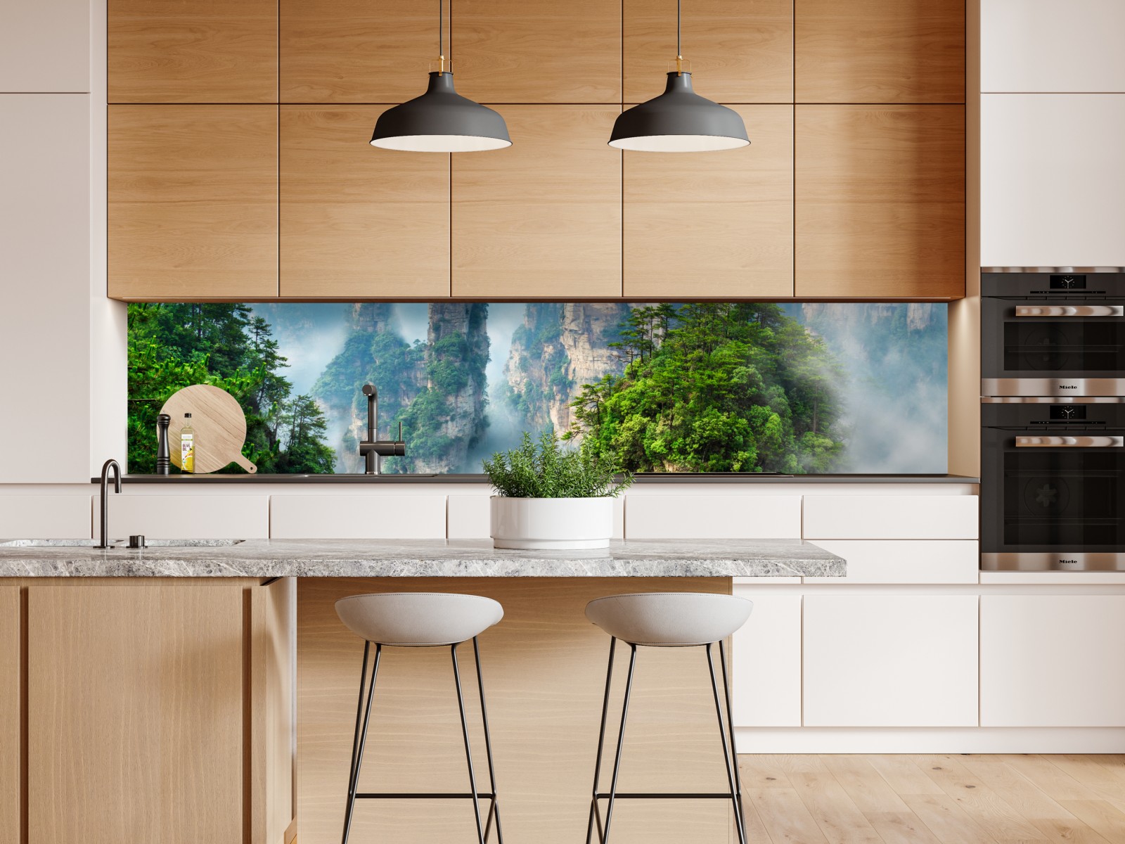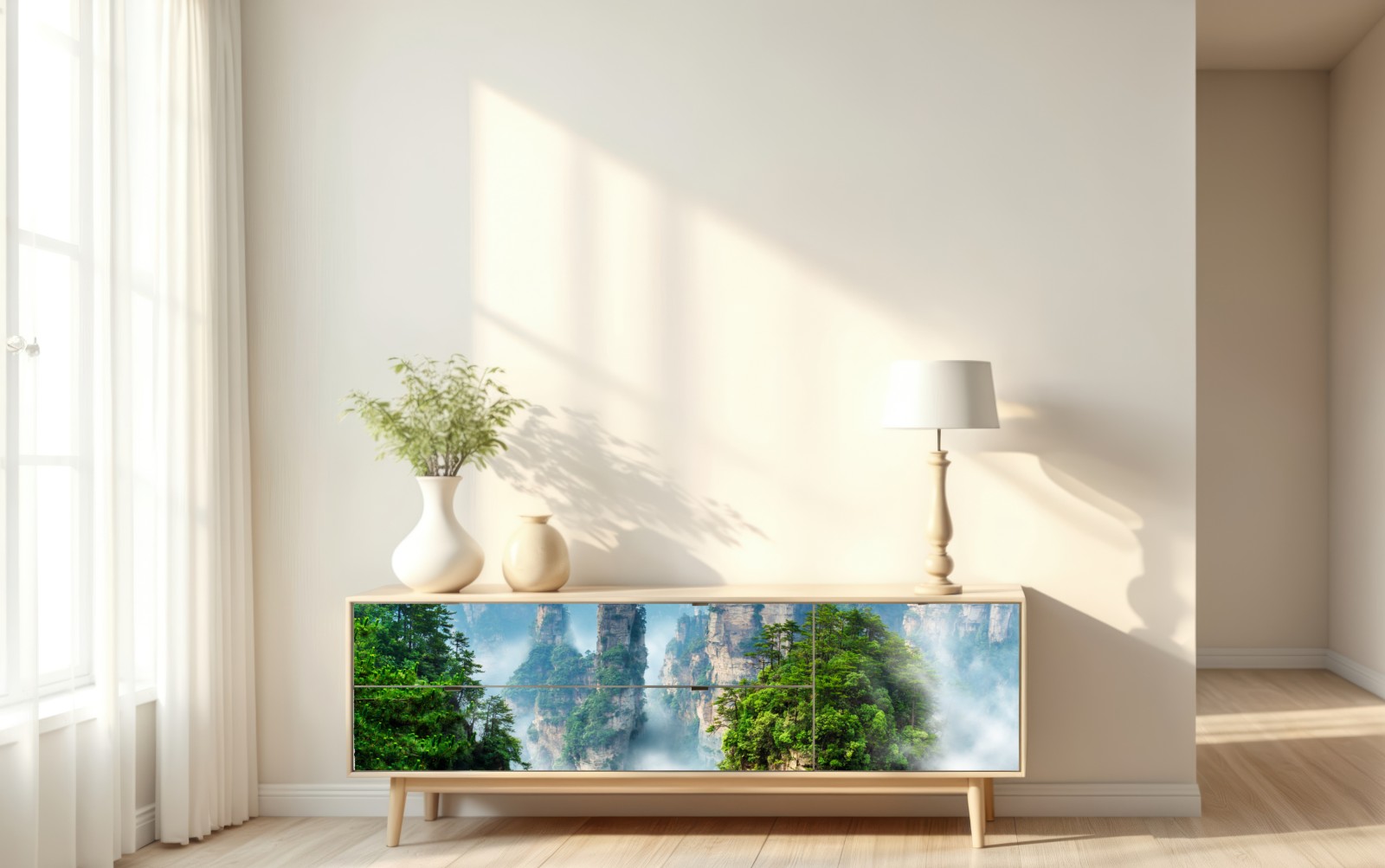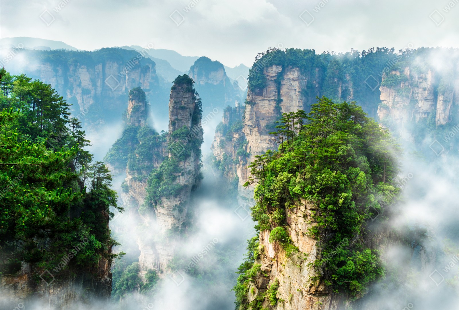 bringen sie ruhe in ihr zuhause mit dieser nebligen berglandschaft mit hohen felsenpfeilern und üppigem grün.