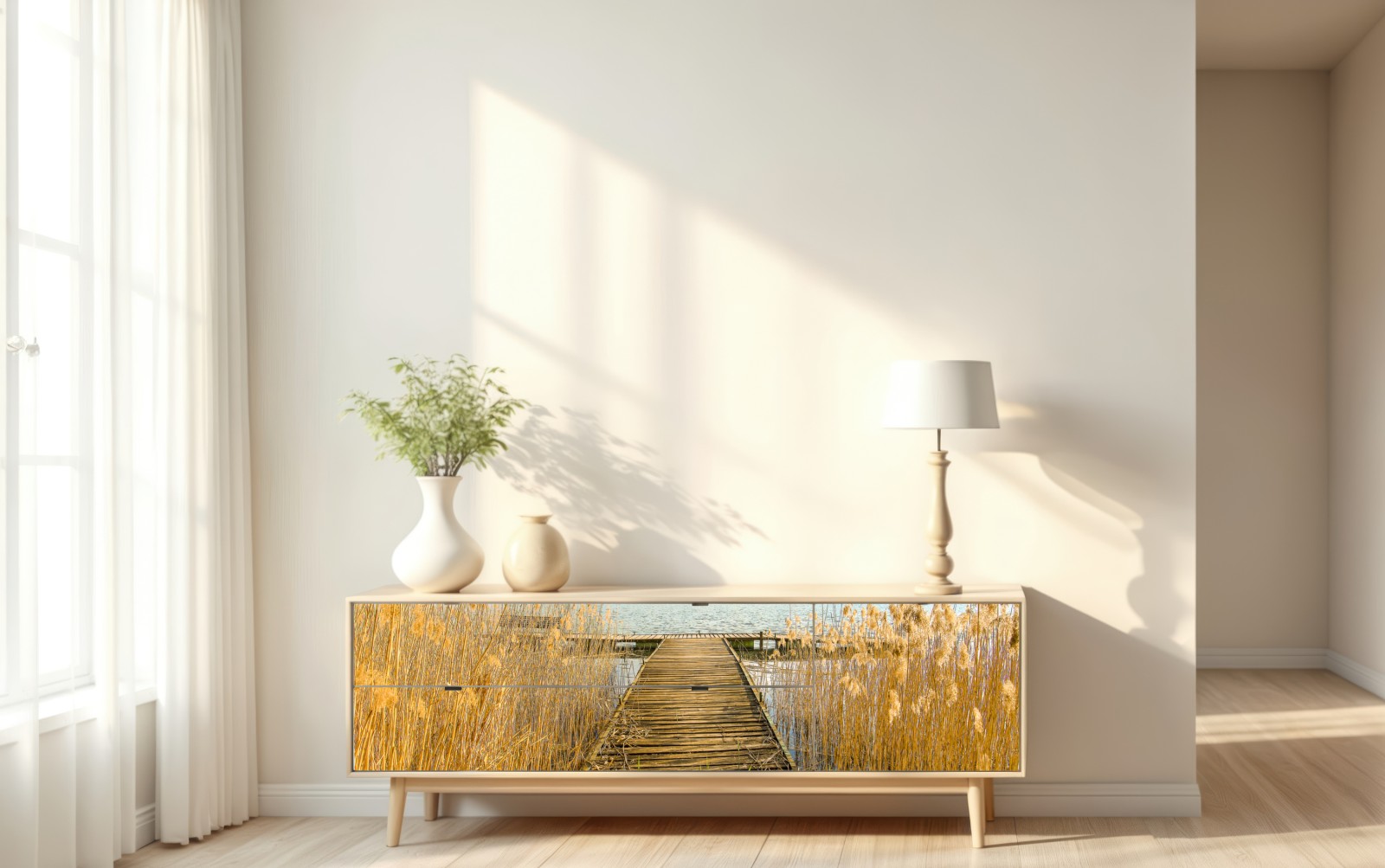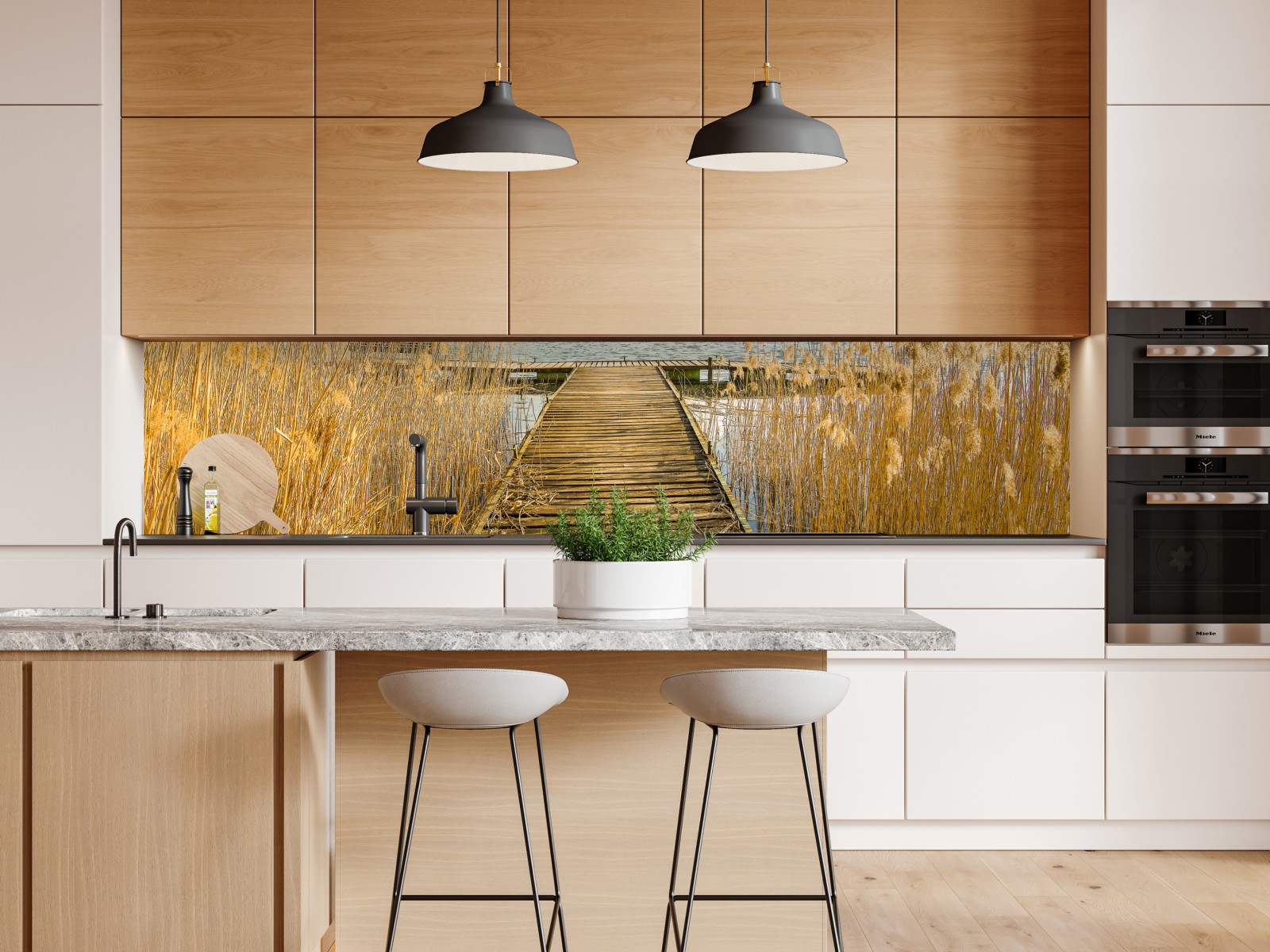 Eine ruhige Seenlandschaft mit einem verwitterten hölzernen Steg und goldenen Schilfhalmen, ideal, um natürliche Ruhe an Ihre Wände zu bringen.