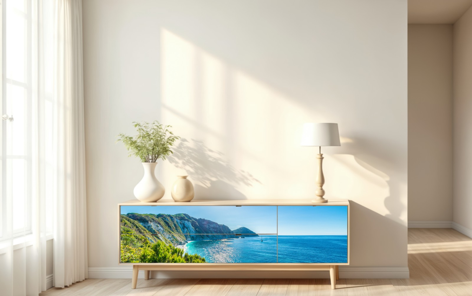 Erleben Sie die Küstenruhe mit dieser sonnigen Panoramaansicht des Strands Sansone auf Elba mit funkelndem türkisblauem Wasser und rauen Klippen.