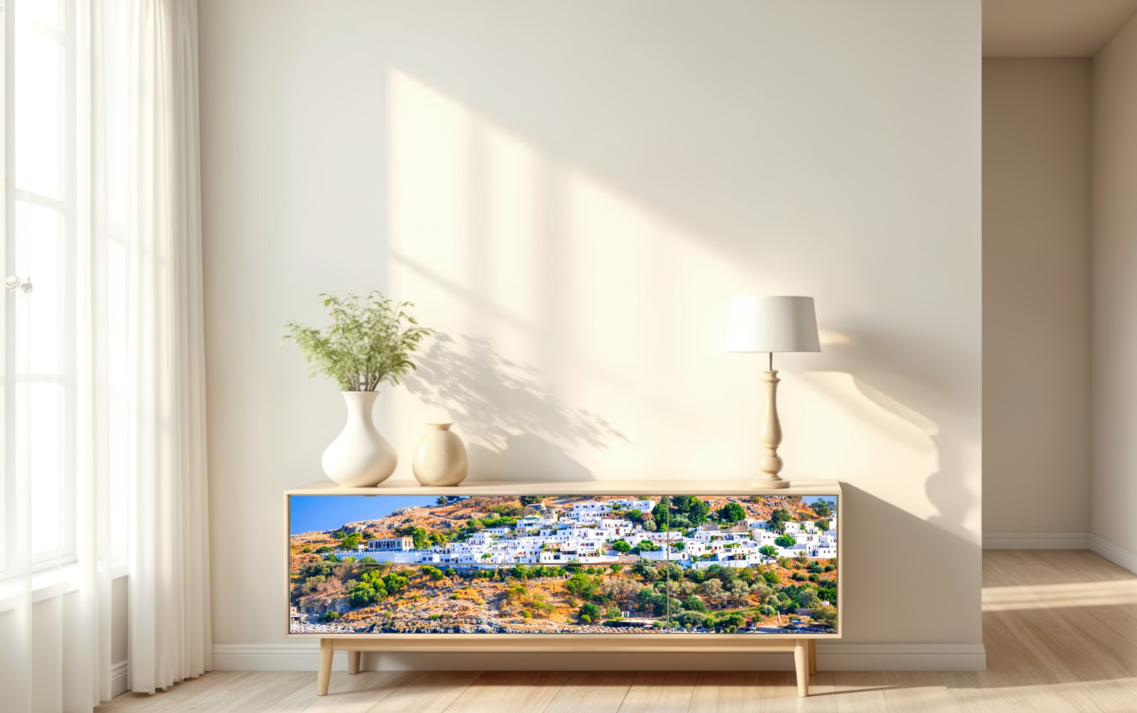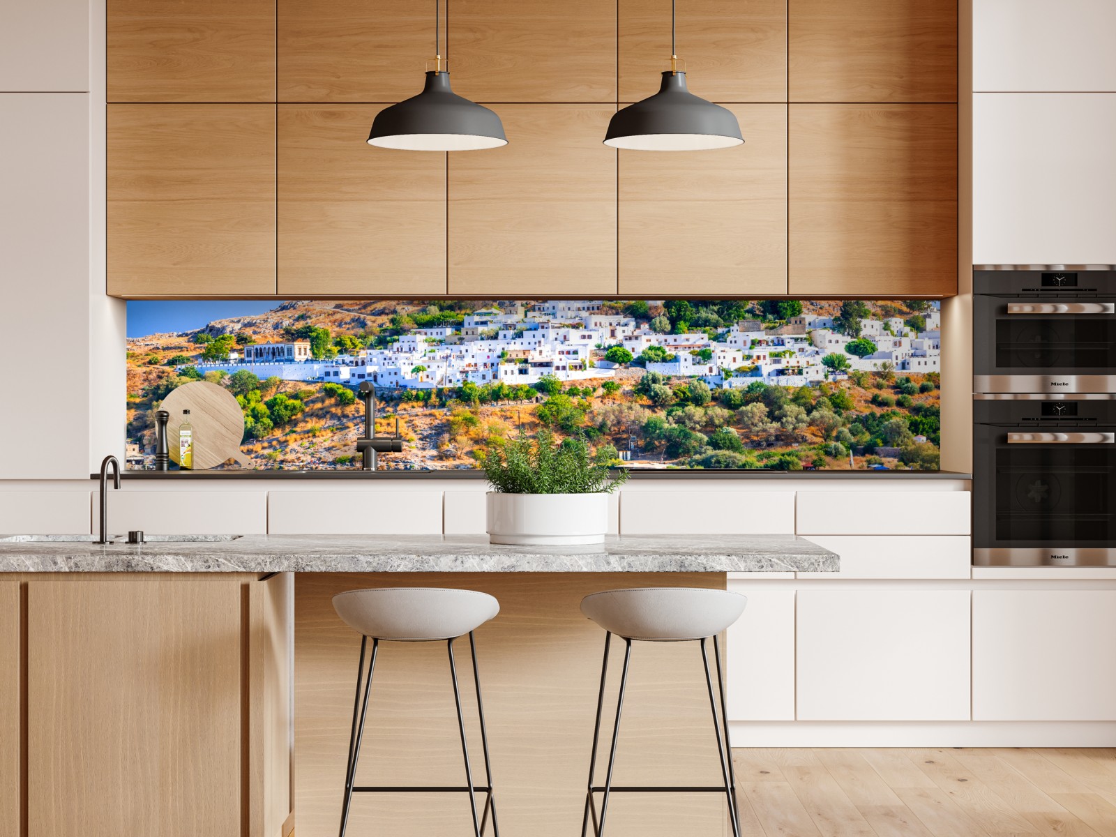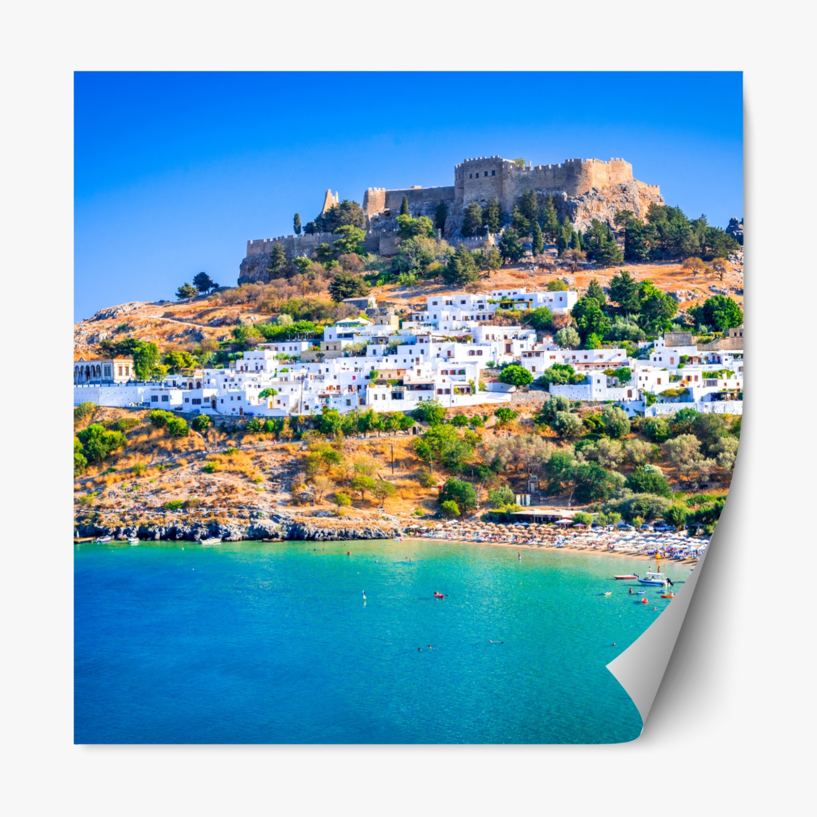 Helles mediterranes Küstenbild mit der Akropolis von Lindos über weiß getünchten Häusern und türkisblauem Wasser, ideal um Urlaubsstimmung ins Zuhause zu bringen.