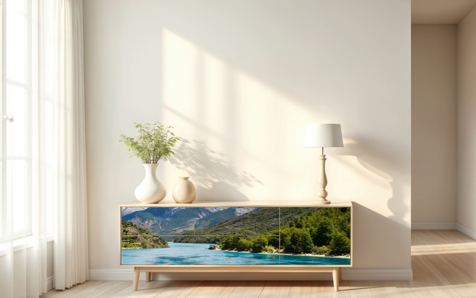 Ein ruhiger türkisfarbener See, umgeben von üppigen Wäldern und schneebedeckten Gipfeln, ideal um beruhigende Naturatmosphäre in den Raum zu bringen.