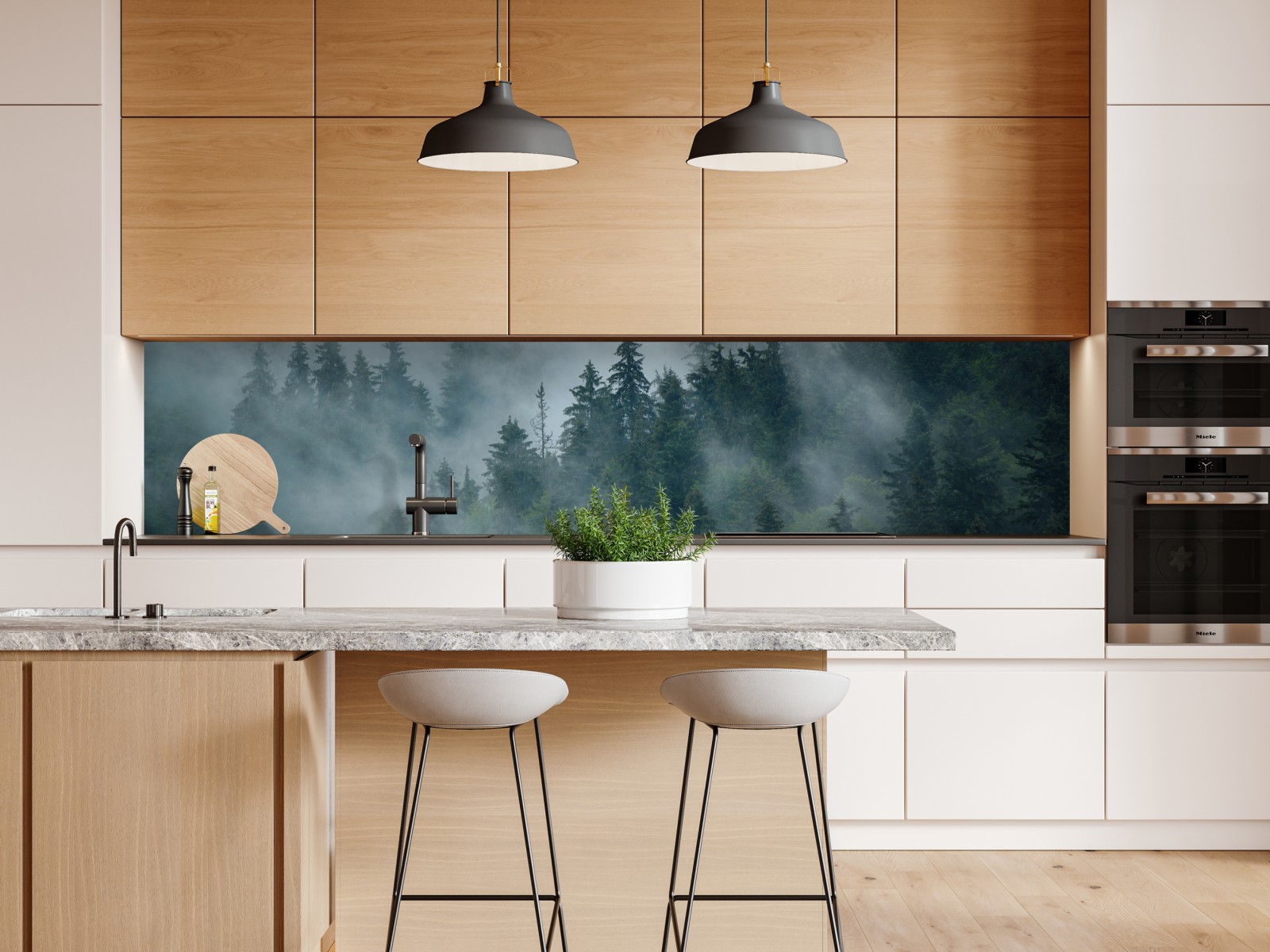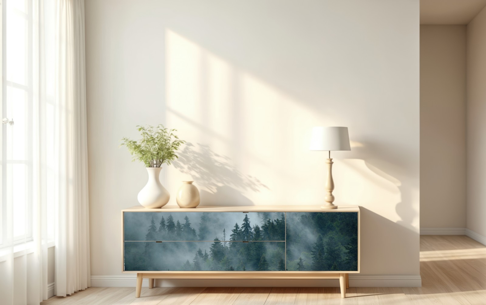 Ein ruhiges, nebeliges Bild eines immergrünen Waldes, das eine natürliche, entspannende Atmosphäre in jeden Raum bringt.