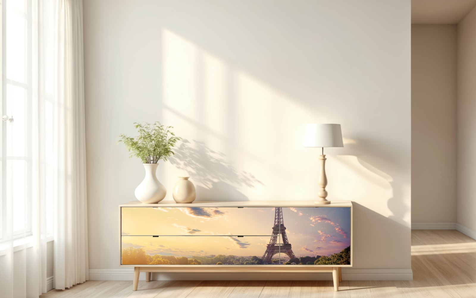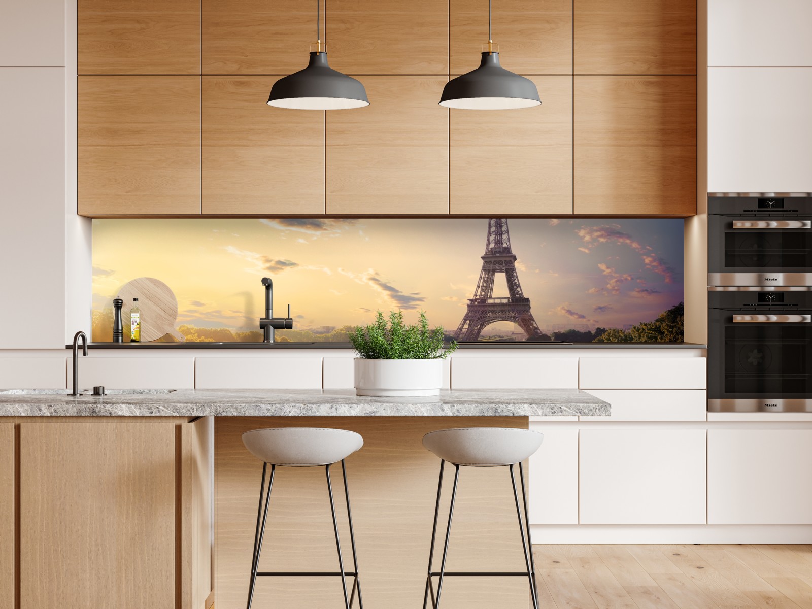 Ein atemberaubendes sonnenbeschienenes Panorama des Eiffelturms bei Dämmerung bringt pariser Flair und Ruhe in jeden Raum.