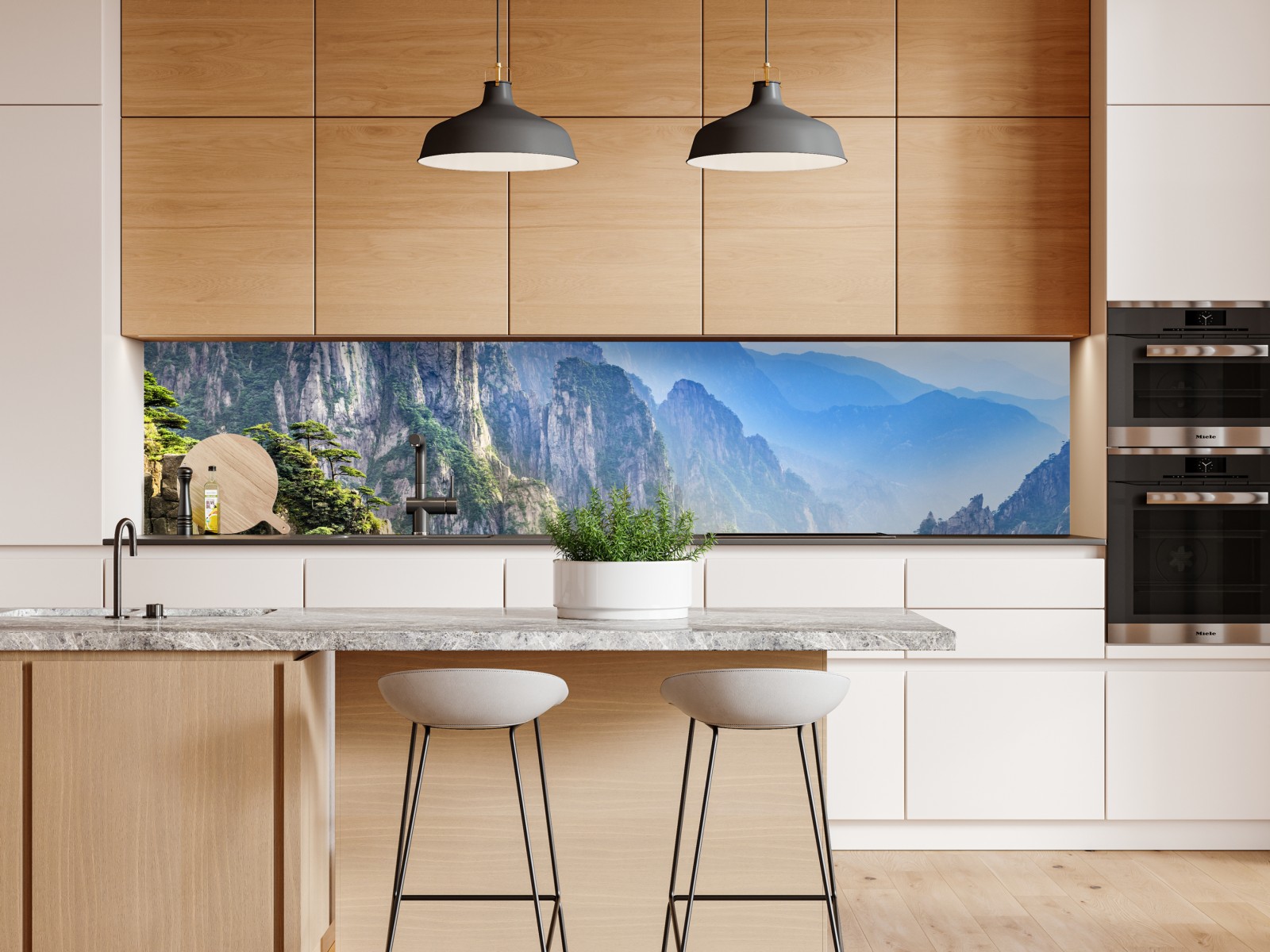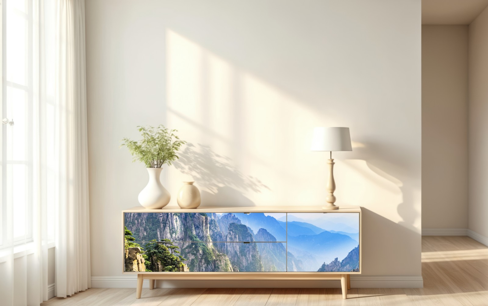 Atemberaubender Blick auf zerklüftete Gipfel und nebelgefüllte Täler, der Ruhe und natürliche Schönheit in jeden Raum bringt.