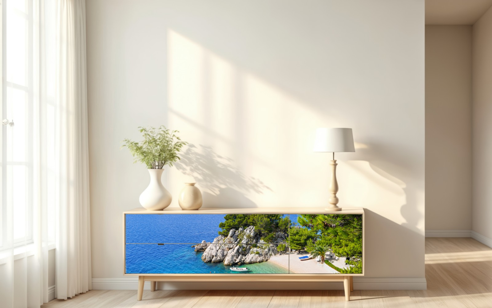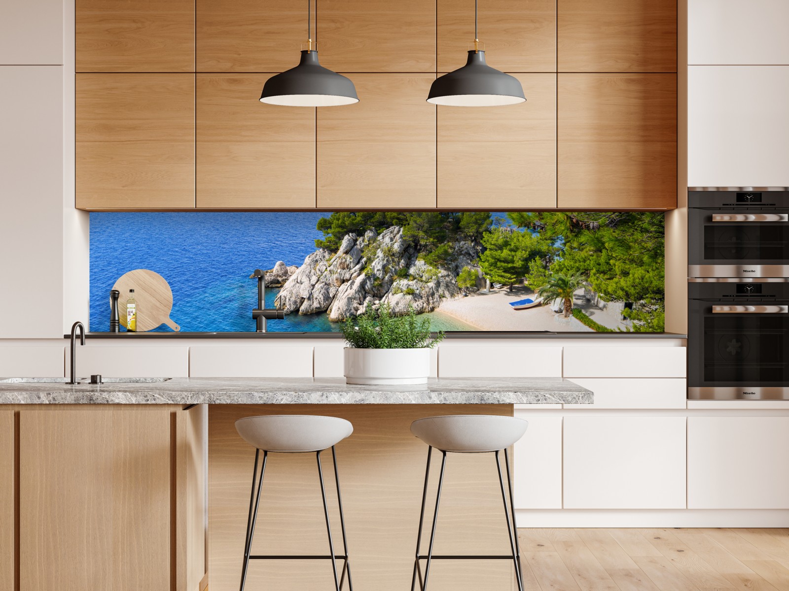 Eine ruhige mediterrane Bucht mit kristallklarem türkisfarbenem Wasser, felsiger Insel und kiefernbewachsenem Strand, die küstliche Gelassenheit in jeden Raum bringt.