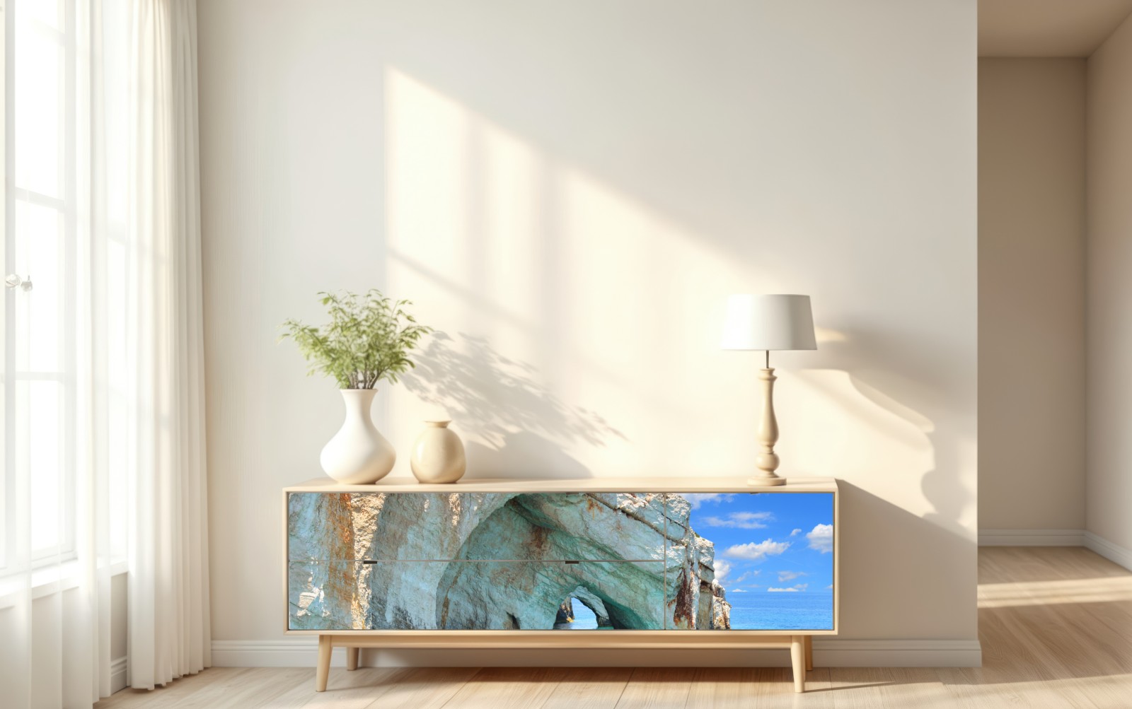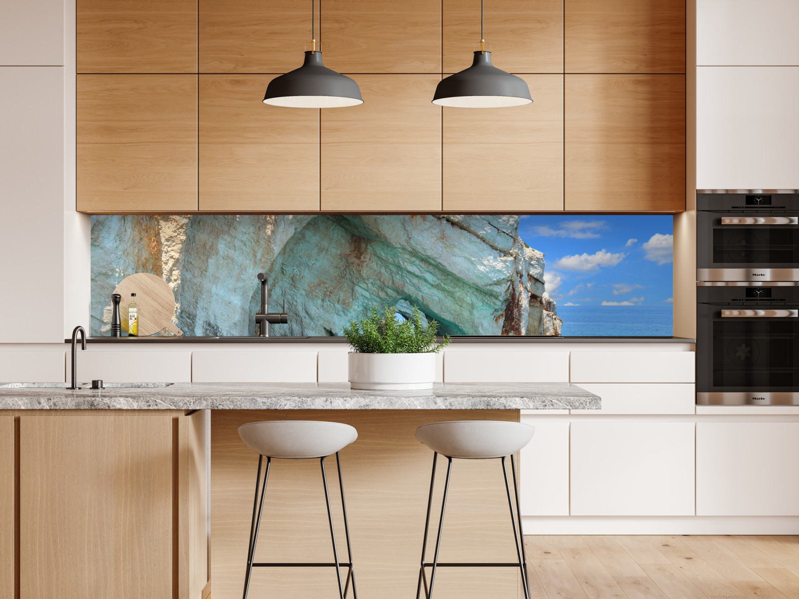 Atemberaubender Küstenblick auf die blauen Höhlen von Zakynthos mit türkisfarbenem Wasser und dramatischen Kalksteinbögen, perfekt um mediterrane Ruhe in Ihr Zuhause zu bringen.