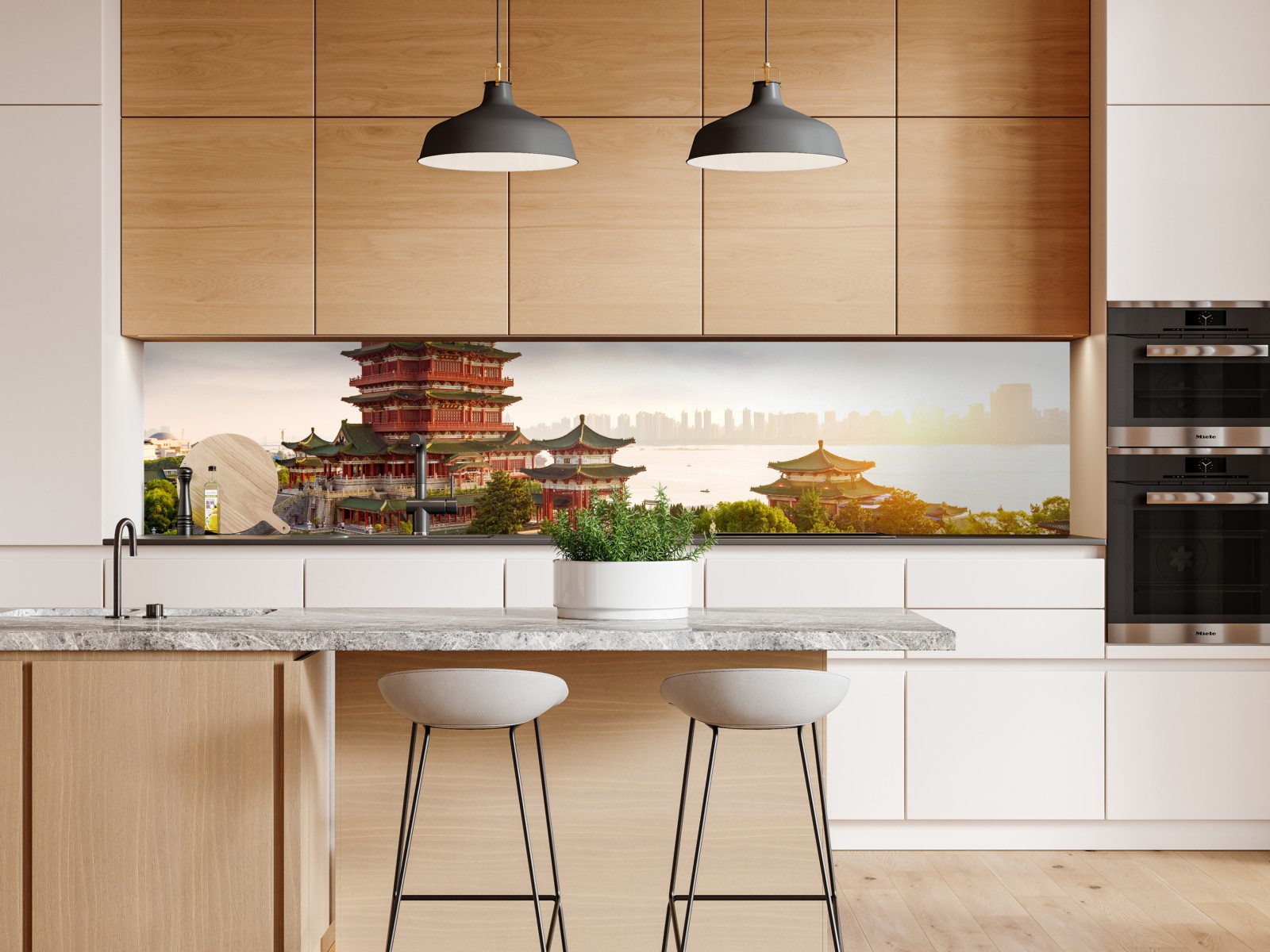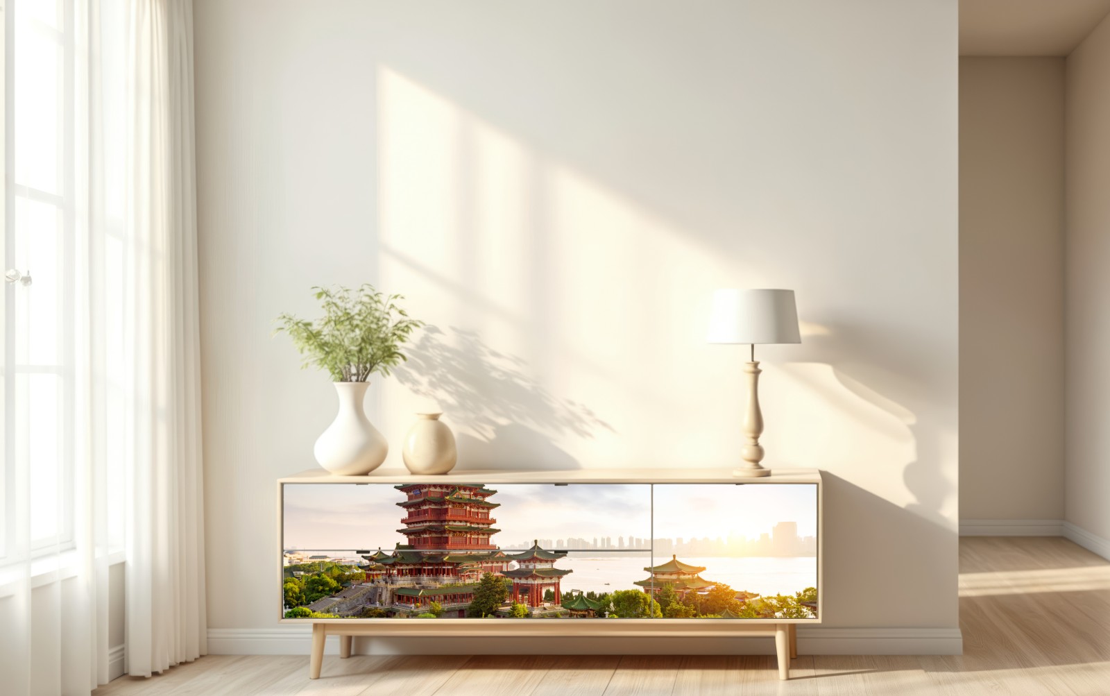 Erleben Sie die zeitlose Schönheit des Tengwang-Pavillons im warmen Morgenlicht mit ruhigem Flussblick, perfekt zur Bereicherung Ihres Raums mit kultureller Eleganz.