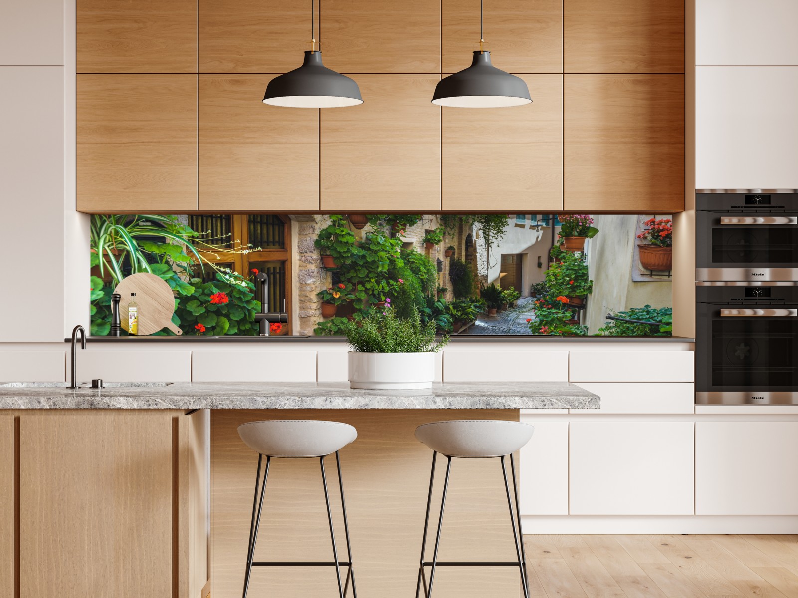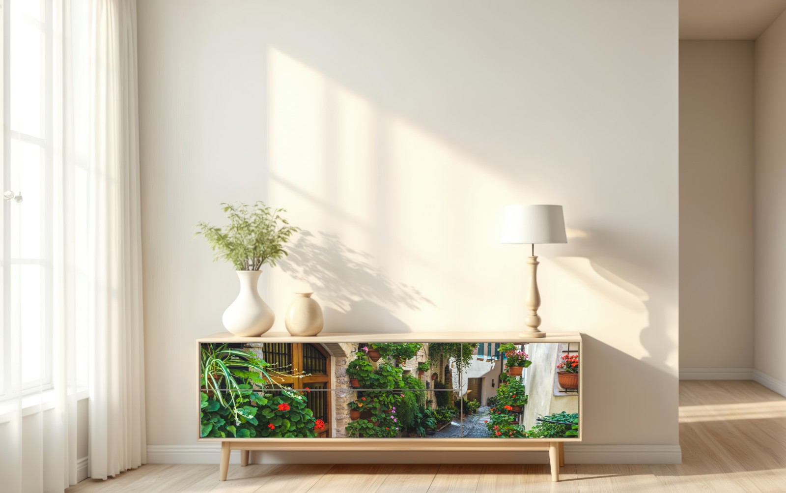 Eine sonnige Kopfsteinpflastergasse mit üppigen Topfpflanzen und historischen Steinfassaden, die mediterranen Charme in Ihr Zuhause bringt.