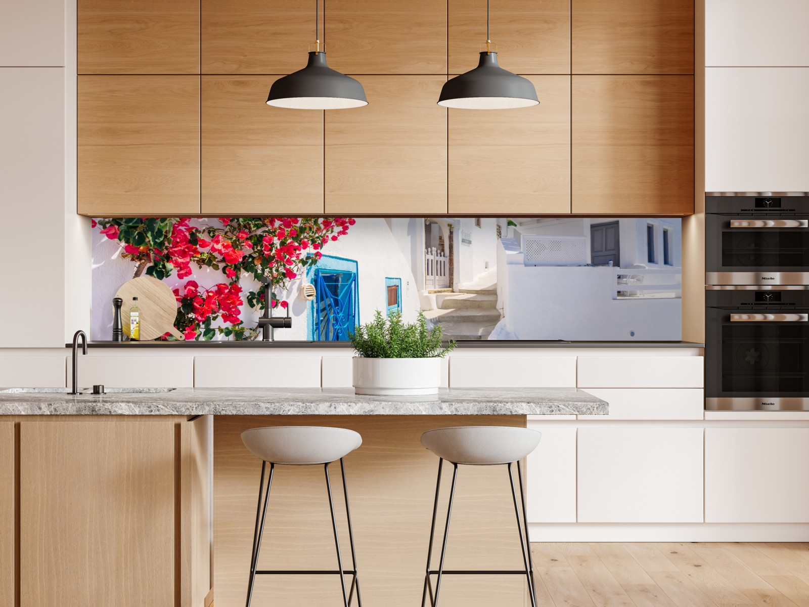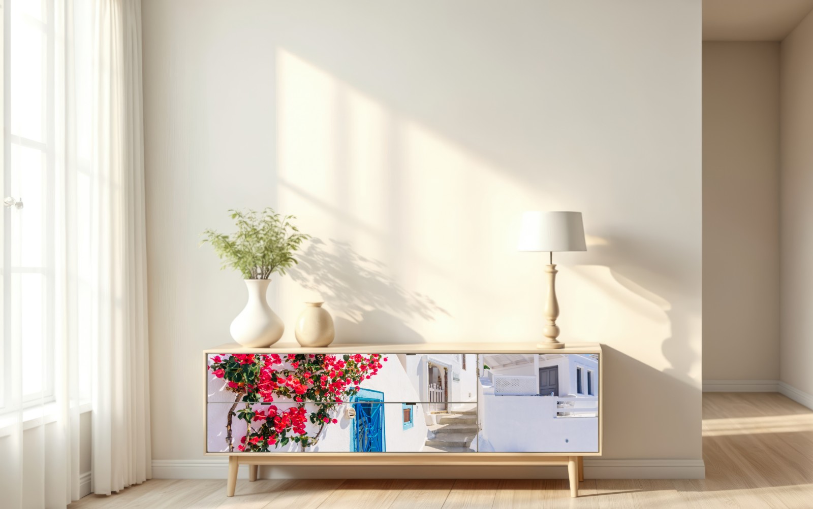 Helle Santorini-Szenerie mit weißgetünchten Häusern, lebhafter Bougainvillea und tiefblauem Himmel bringt mediterranen Sommerflair in Ihr Zuhause.