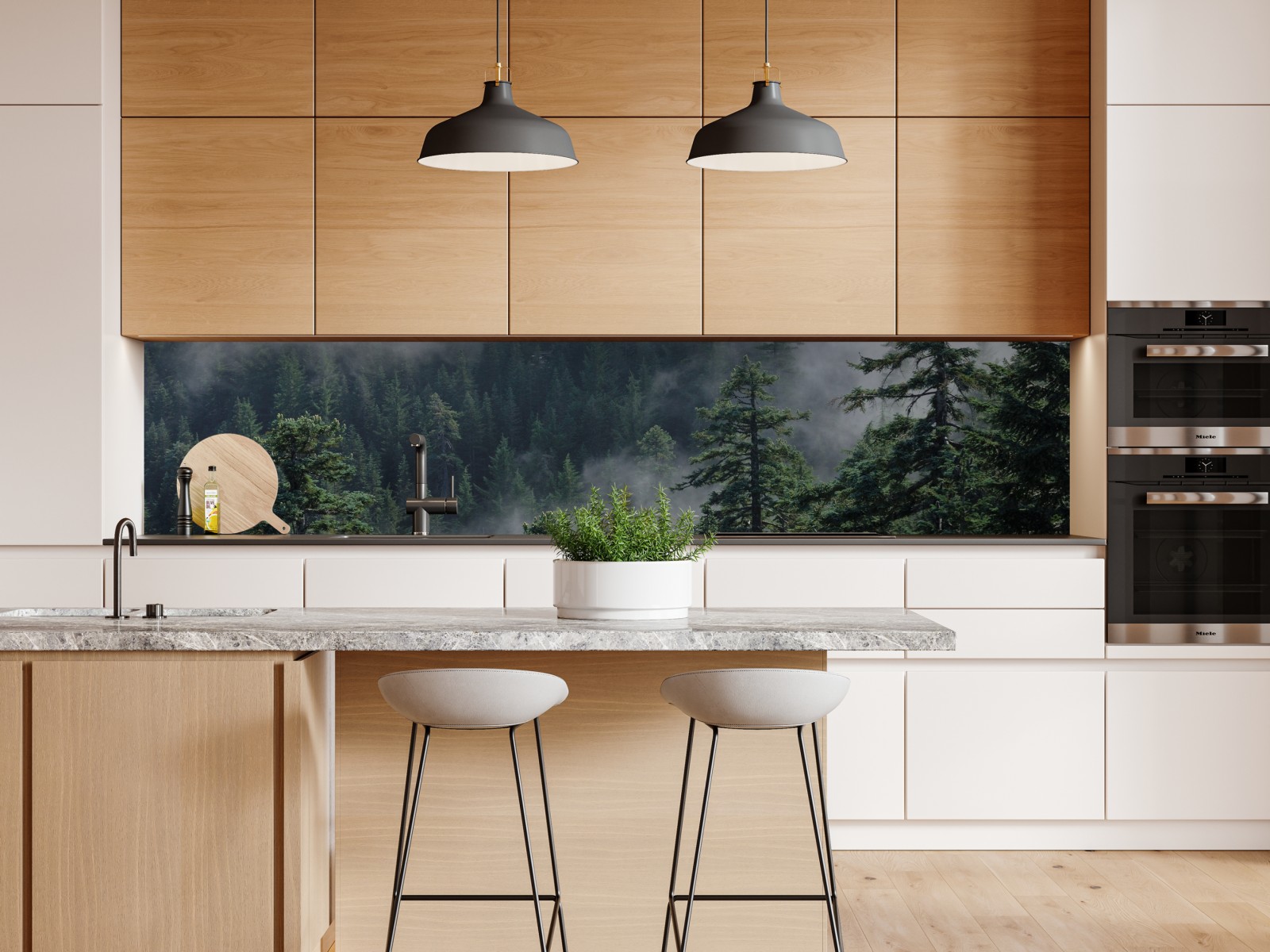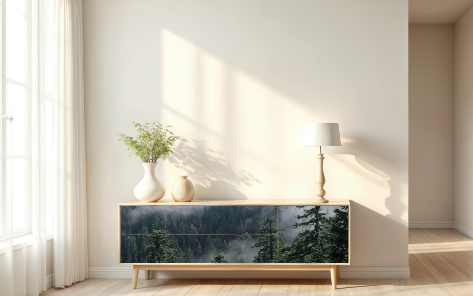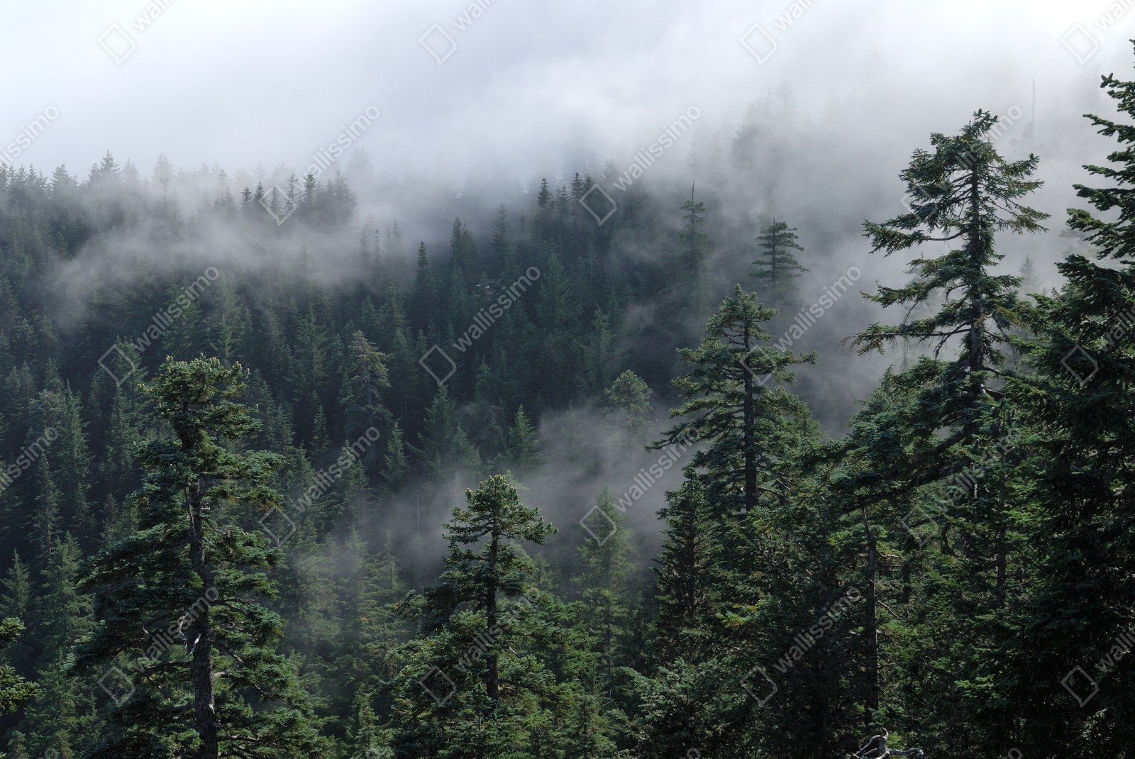 Bringen Sie die ruhige Stimmung des Pazifischen Nordwestens in Ihr Zuhause mit dieser nebligen Waldszene, die hohe Nadelbäume und sanften Nebel für eine beruhigende, naturbezogene Atmosphäre zeigt.